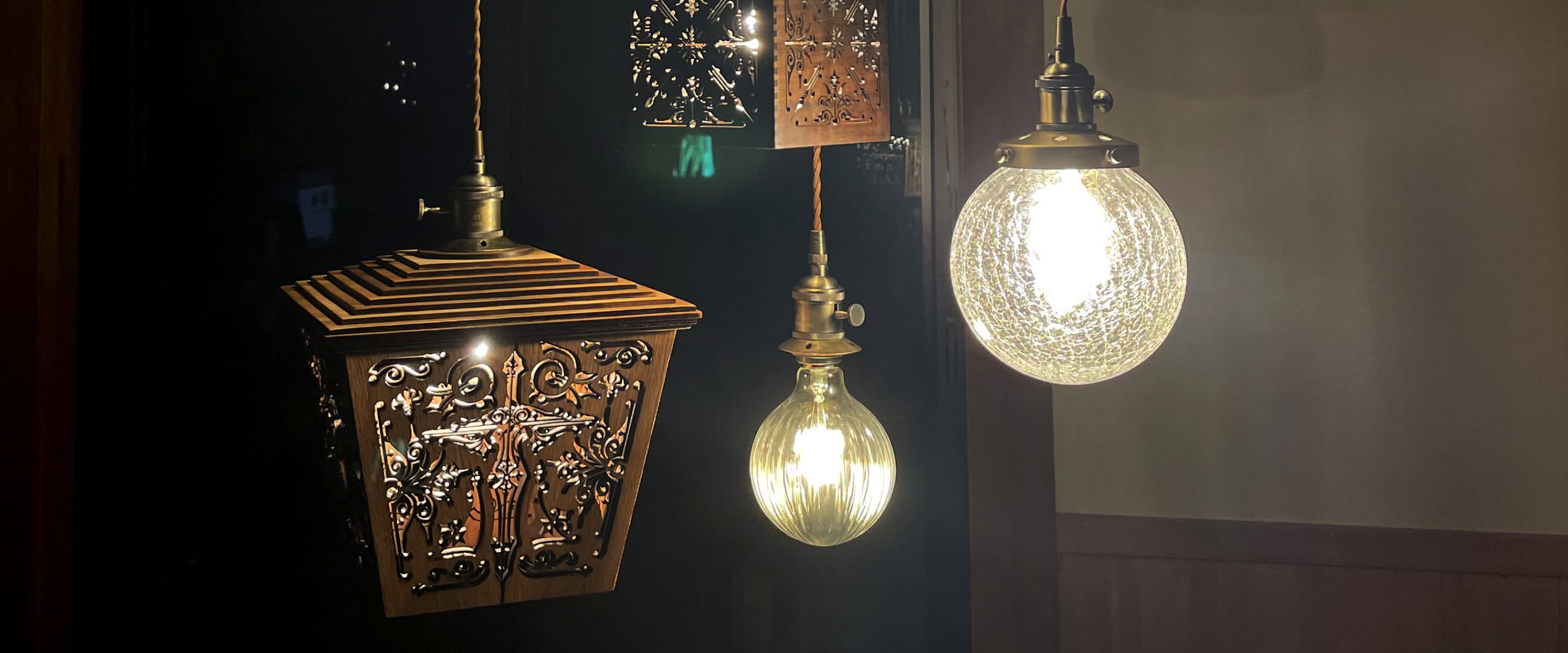 レーザー加工や寄木細工風のデザイン、さらにはLEDを仕込んだ間接照明の装飾など、空間に立体感と温もりを添える木工作品の制作