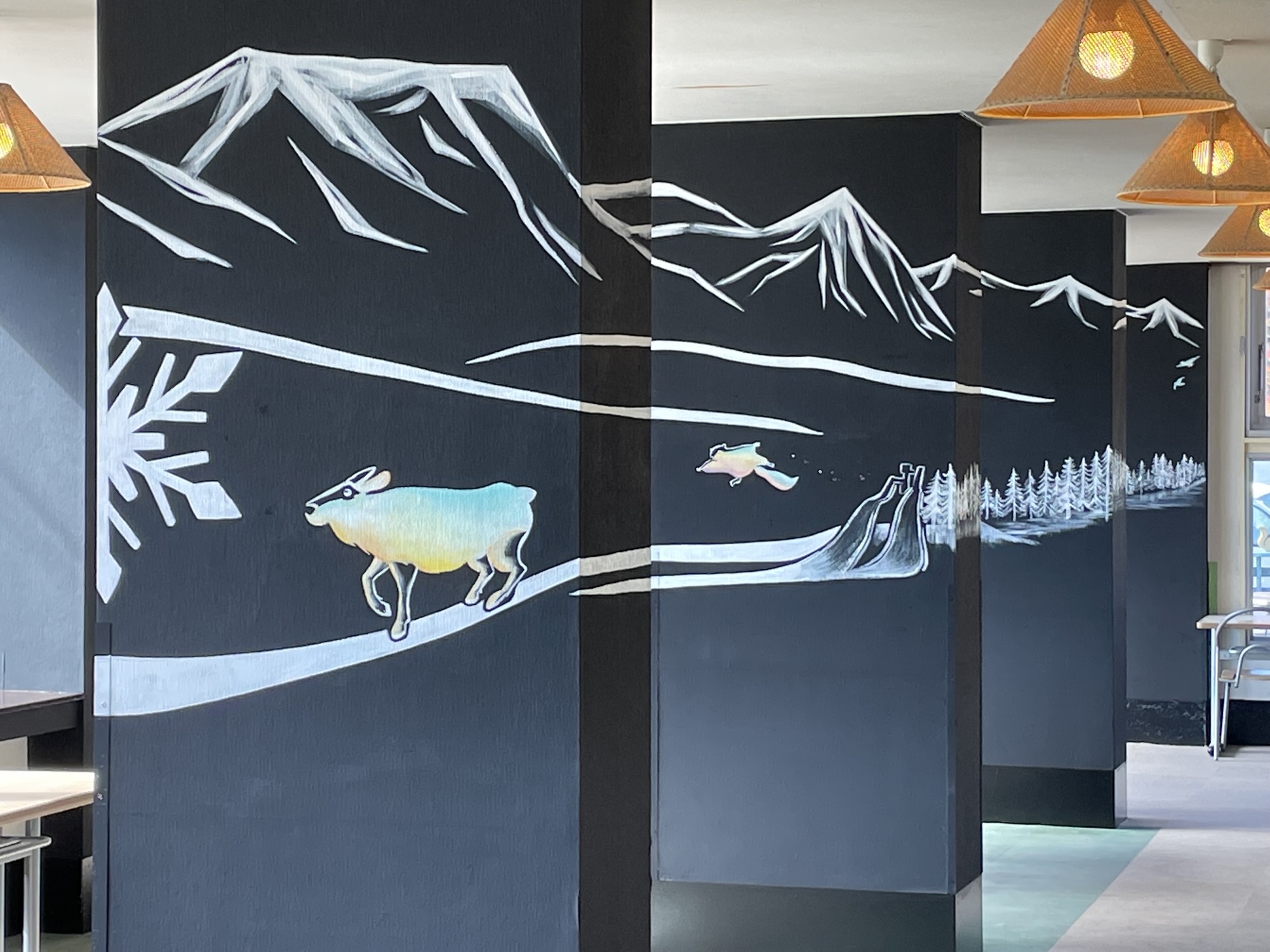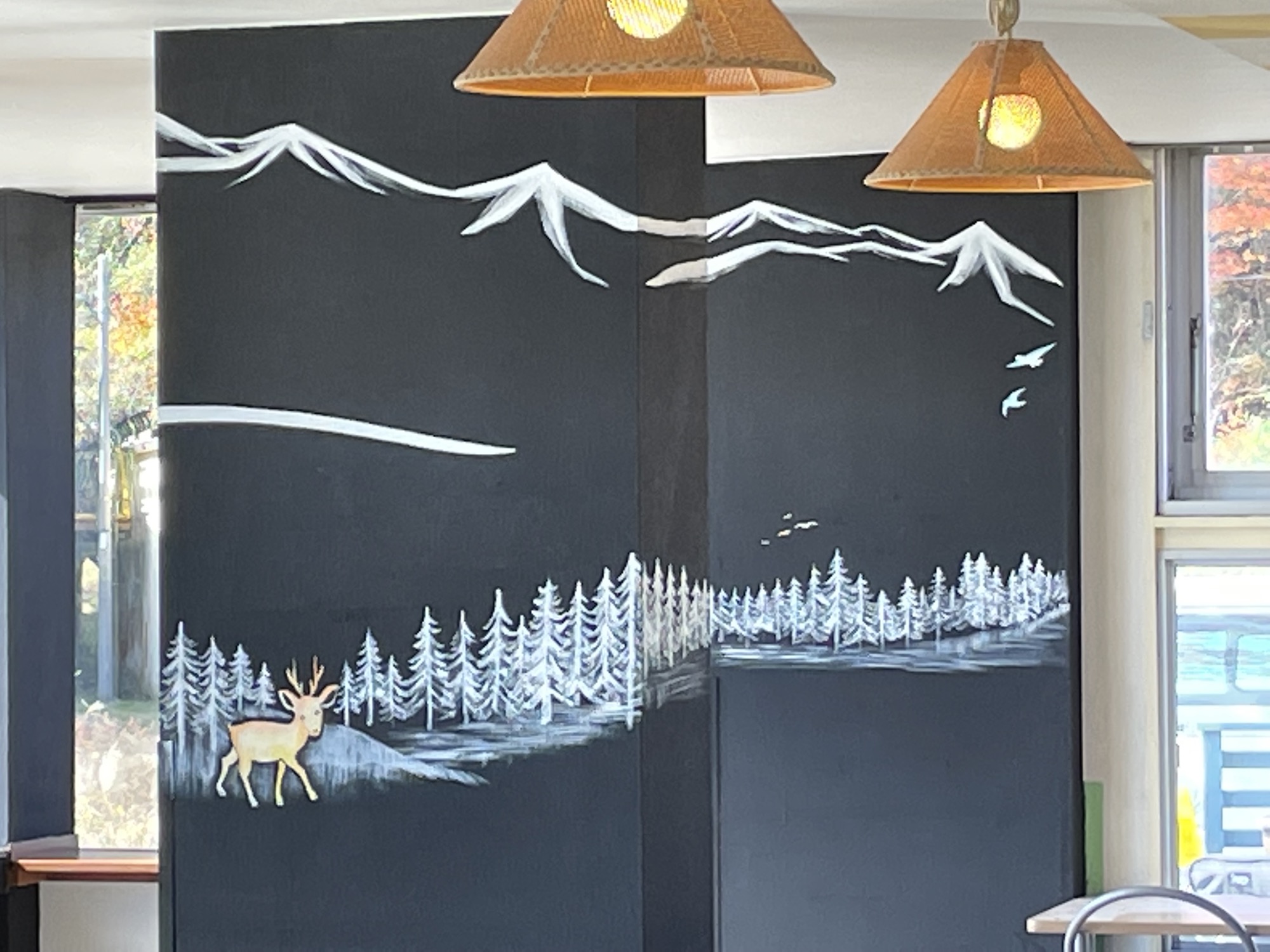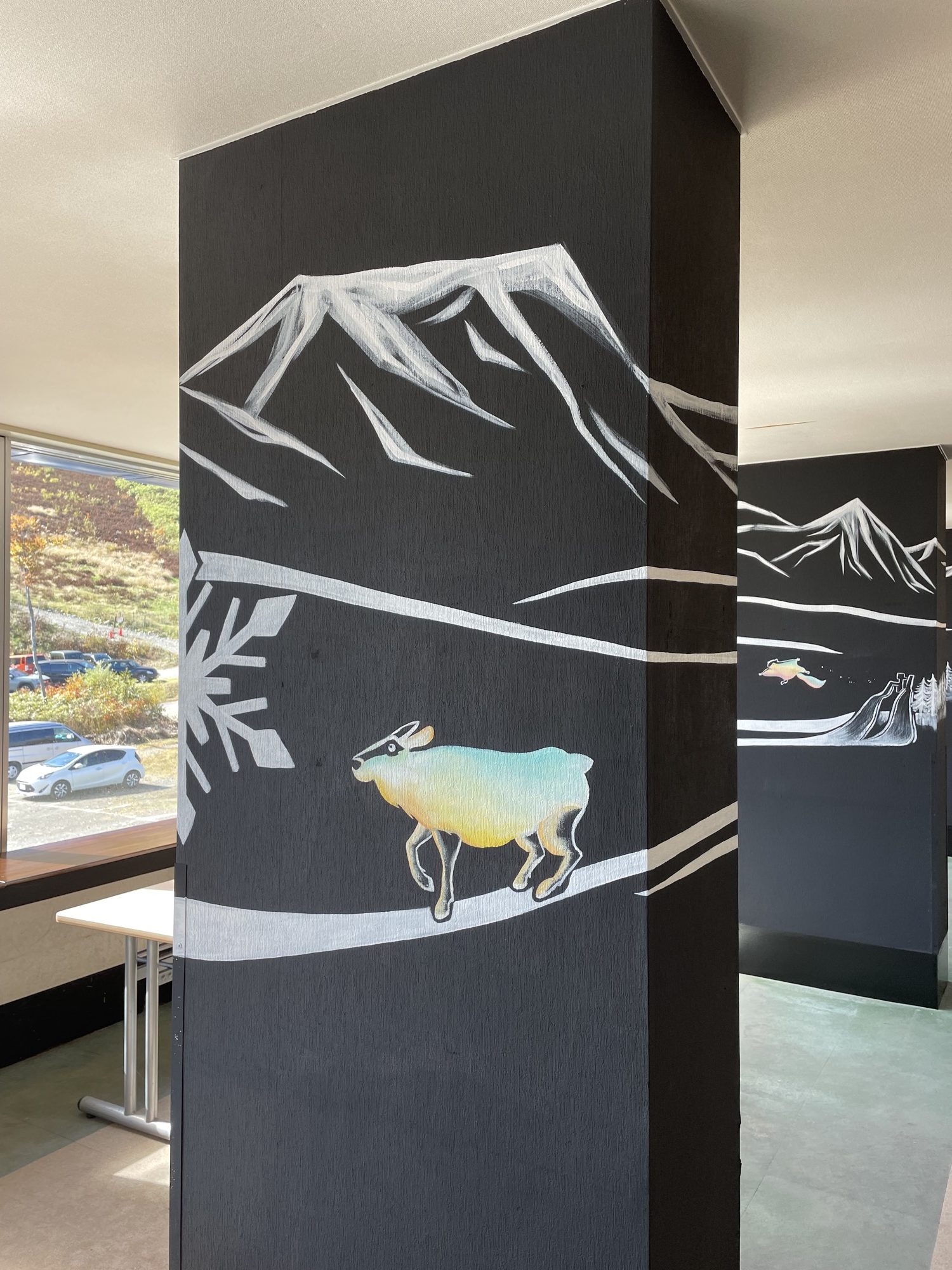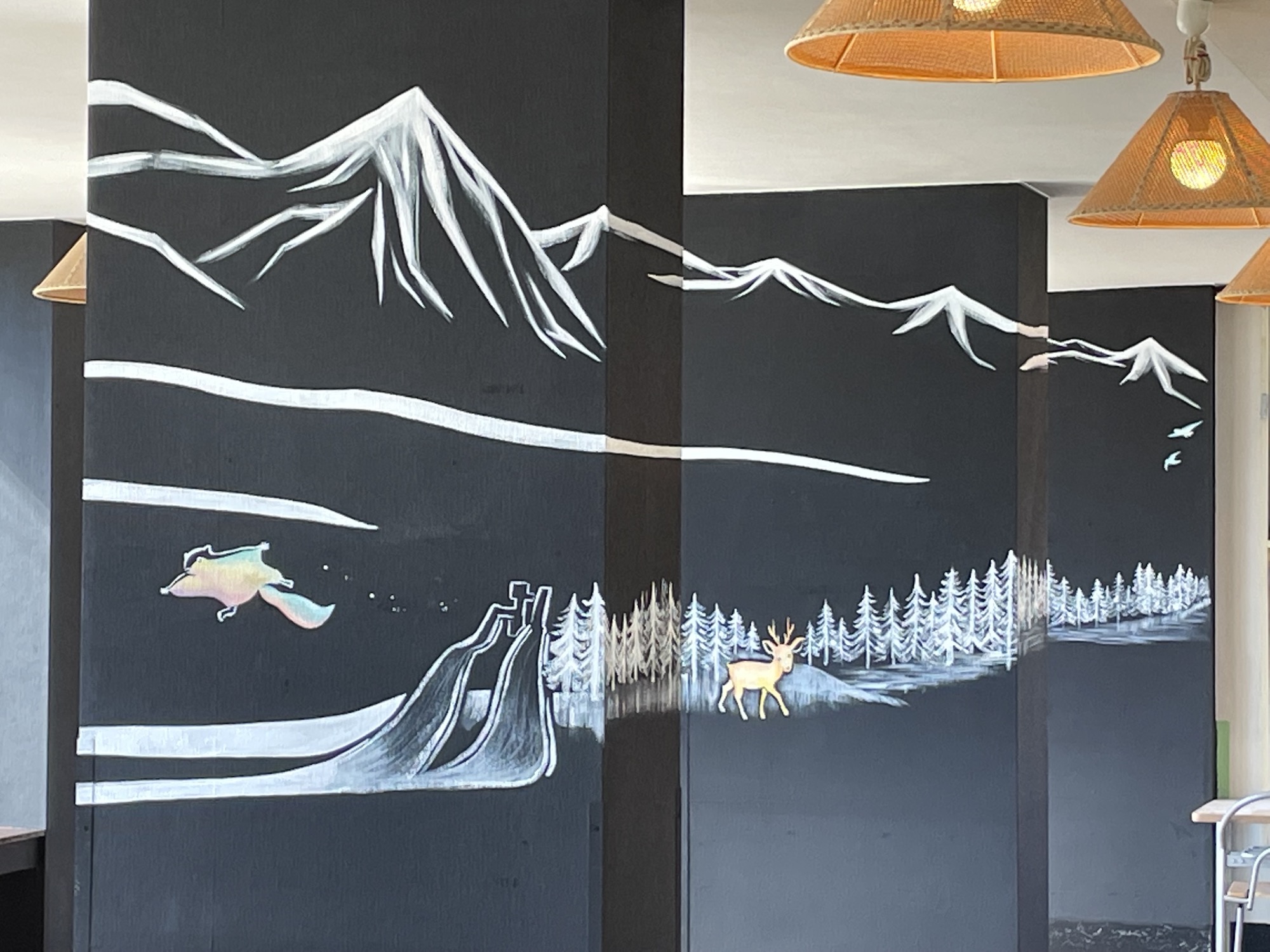 I created a mural for BEARS CAFE inside the Happo-One Ski Resort (Sakka Restaurant House) in Hakuba, Nagano. To match the main audience visiting the Sakka slope, I chose a colorful, family-friendly palette. Motifs include the mountain ridges seen from Hakuba, the townscape, and local animals.