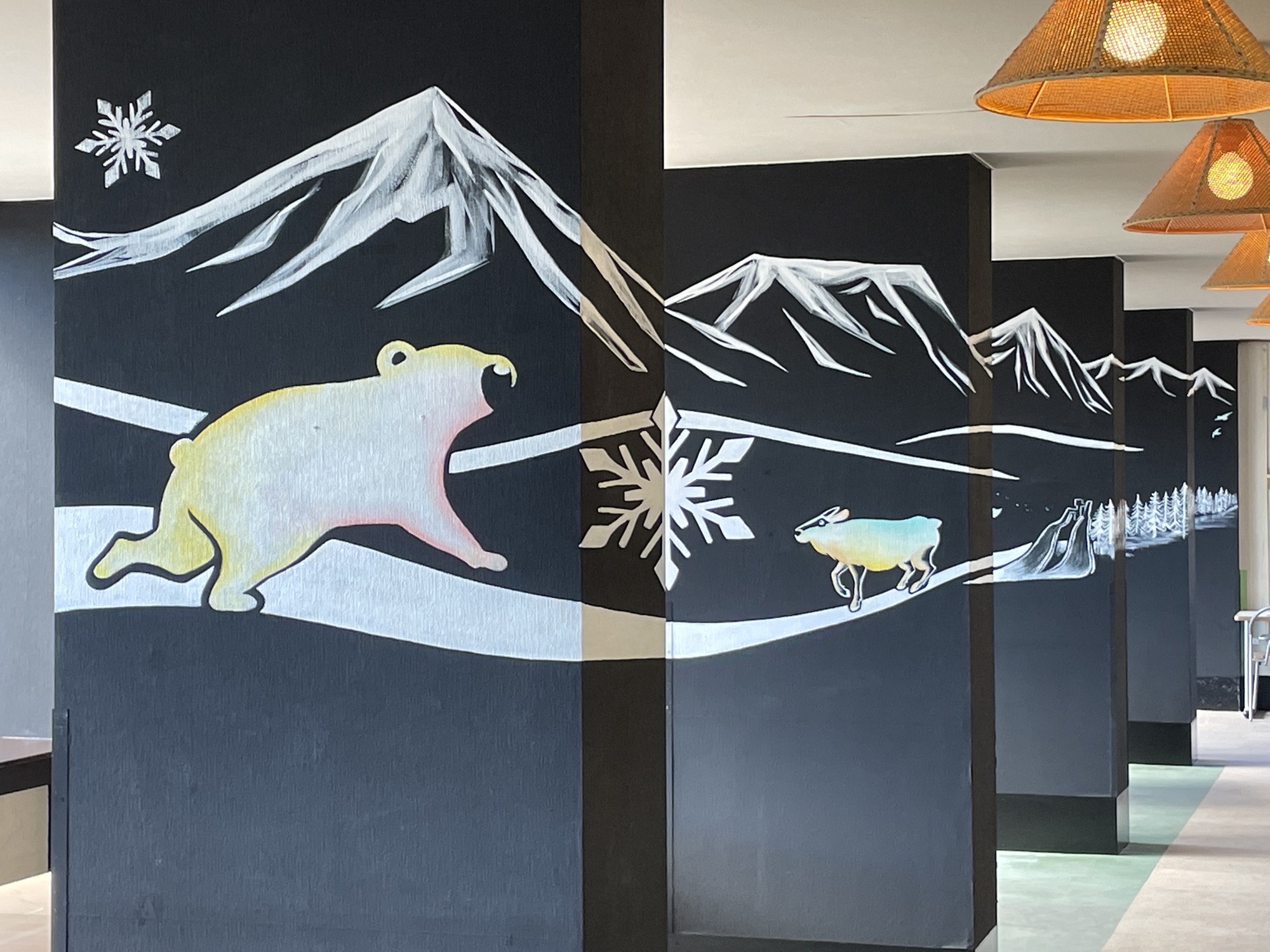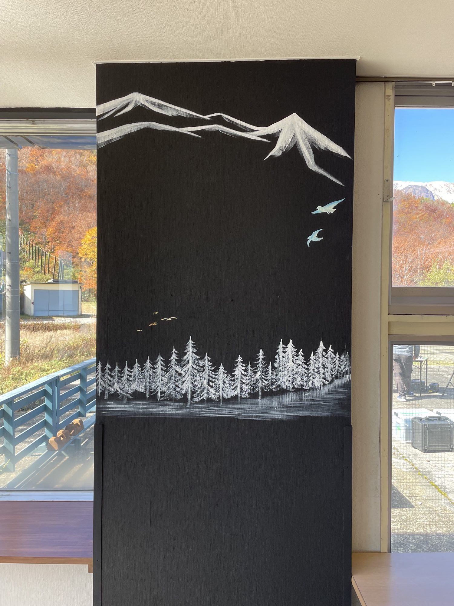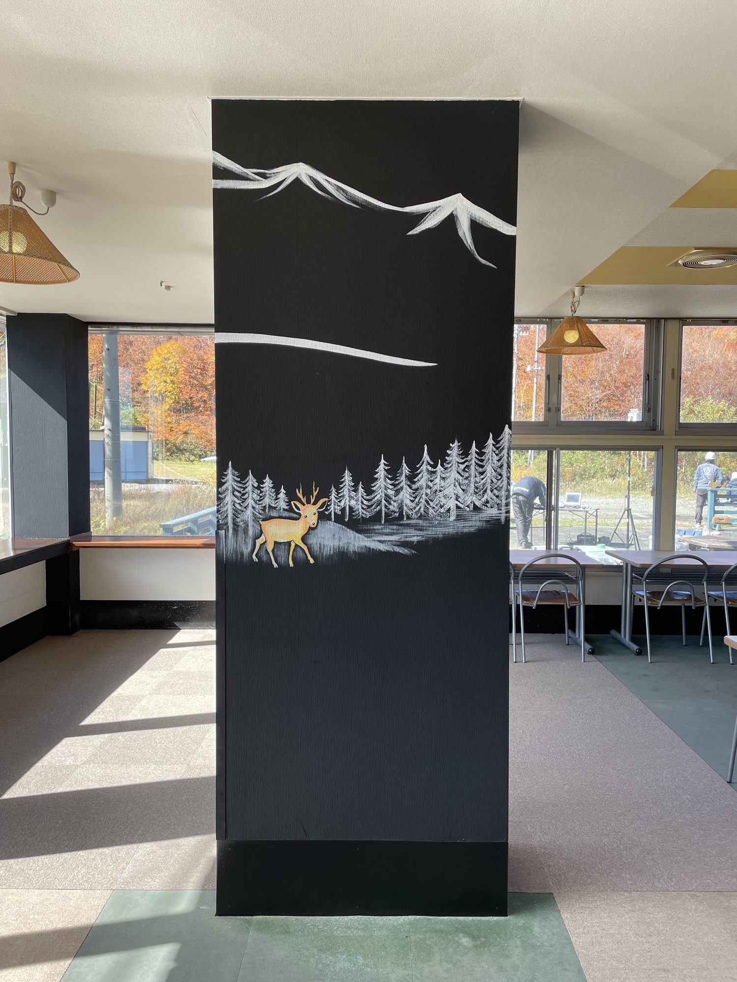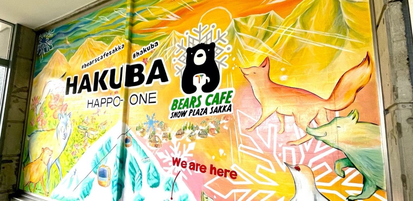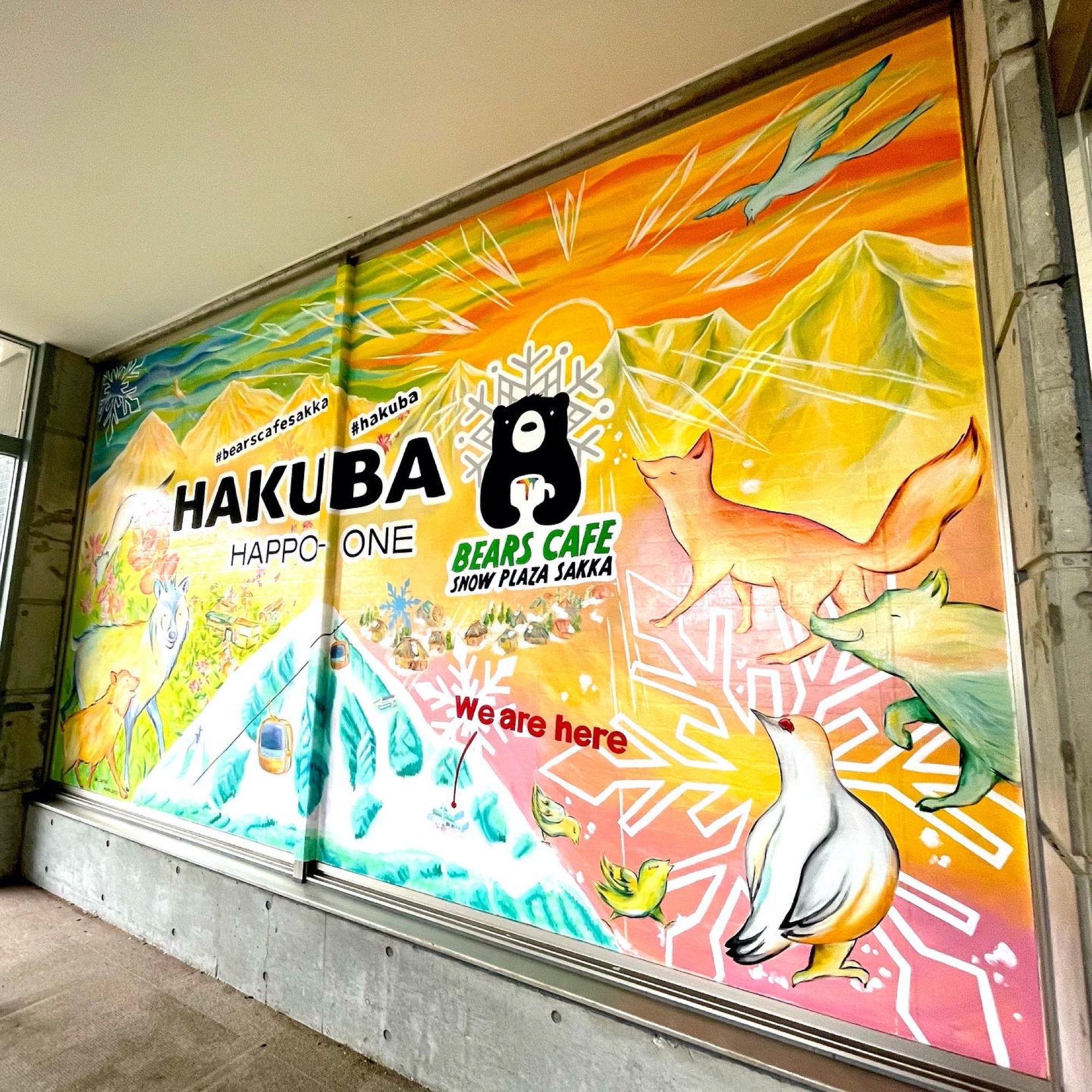 I created a mural for BEARS CAFE inside the Happo-One Ski Resort (Sakka Restaurant House) in Hakuba, Nagano. To match the main audience visiting the Sakka slope, I chose a colorful, family-friendly palette. Motifs include the mountain ridges seen from Hakuba, the townscape, and local animals.