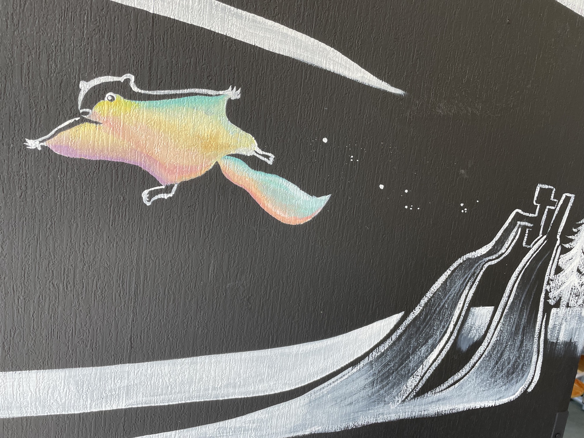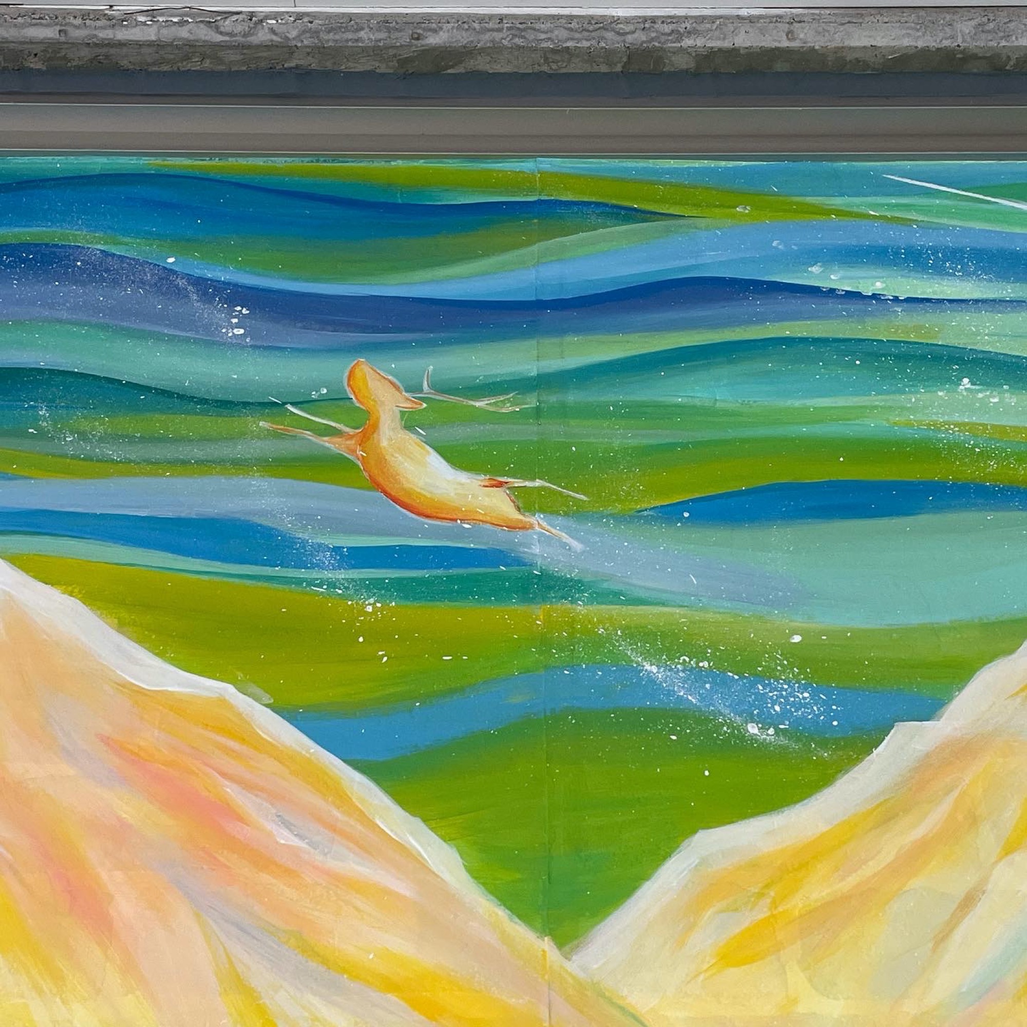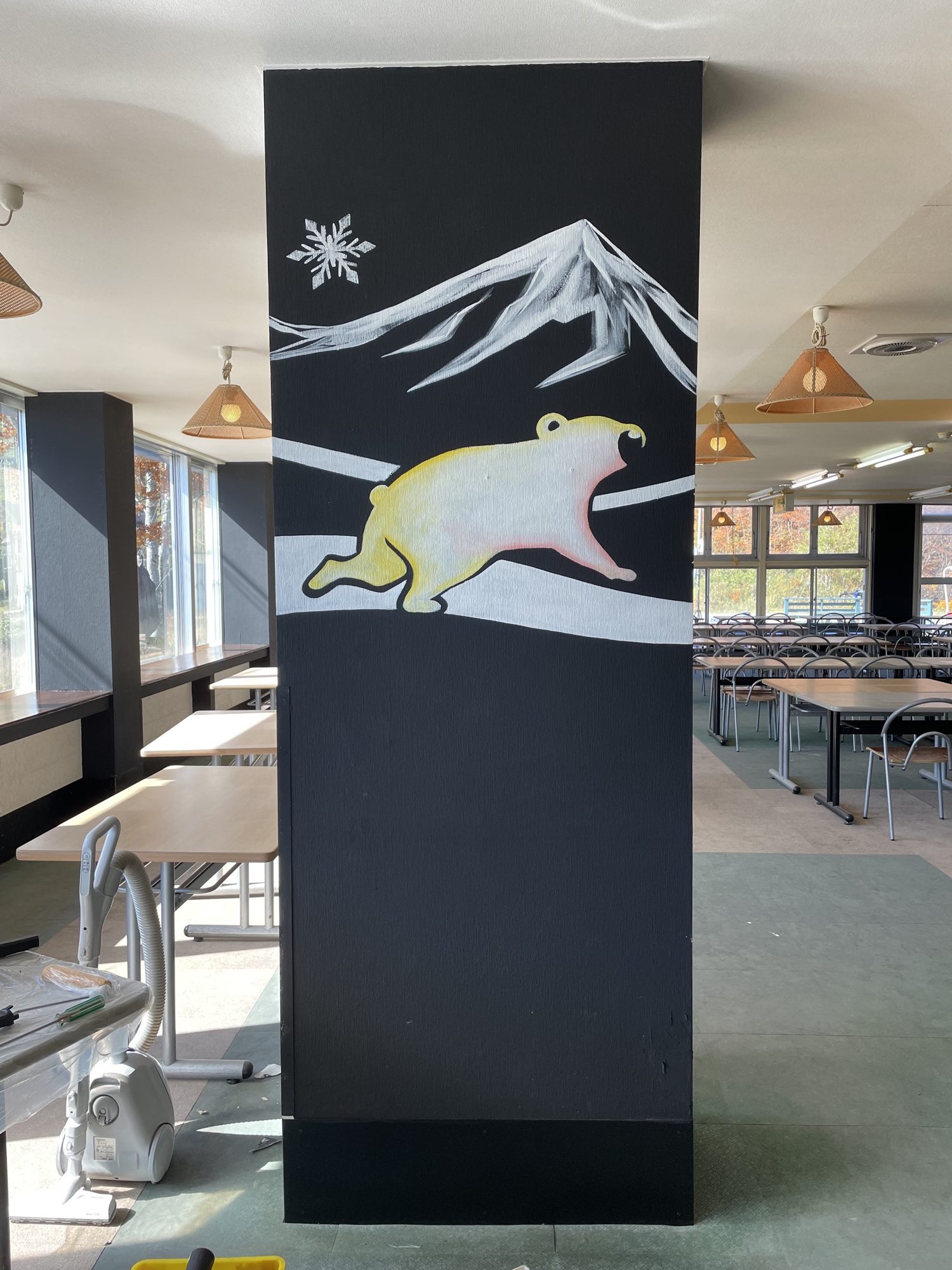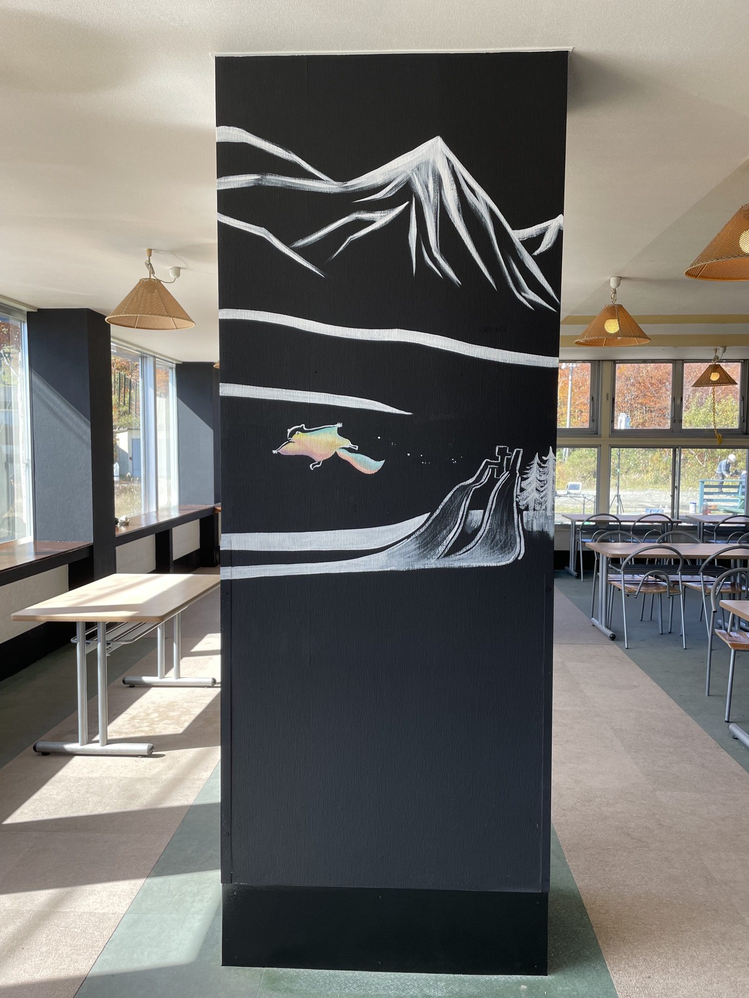 I created a mural for BEARS CAFE inside the Happo-One Ski Resort (Sakka Restaurant House) in Hakuba, Nagano. To match the main audience visiting the Sakka slope, I chose a colorful, family-friendly palette. Motifs include the mountain ridges seen from Hakuba, the townscape, and local animals.