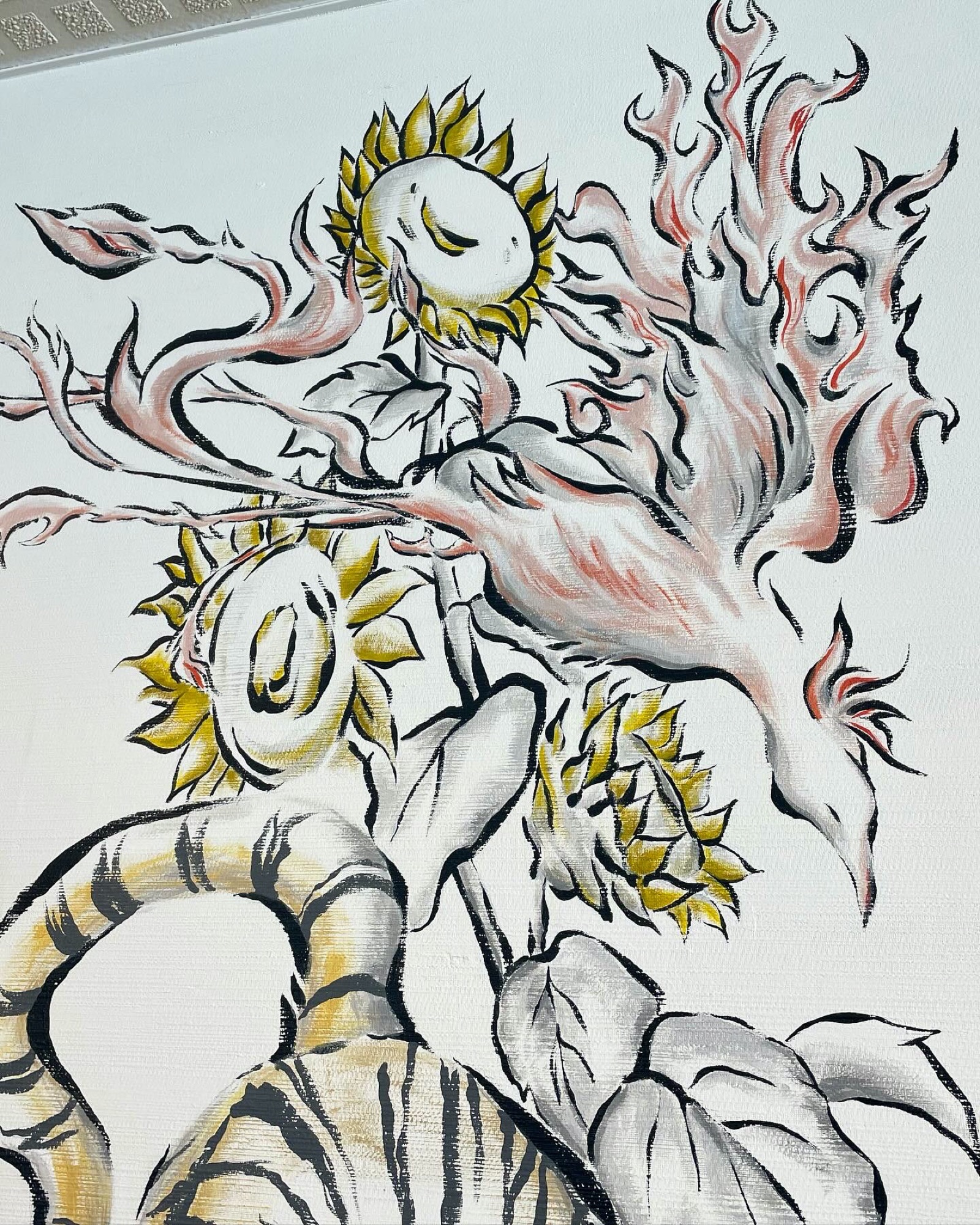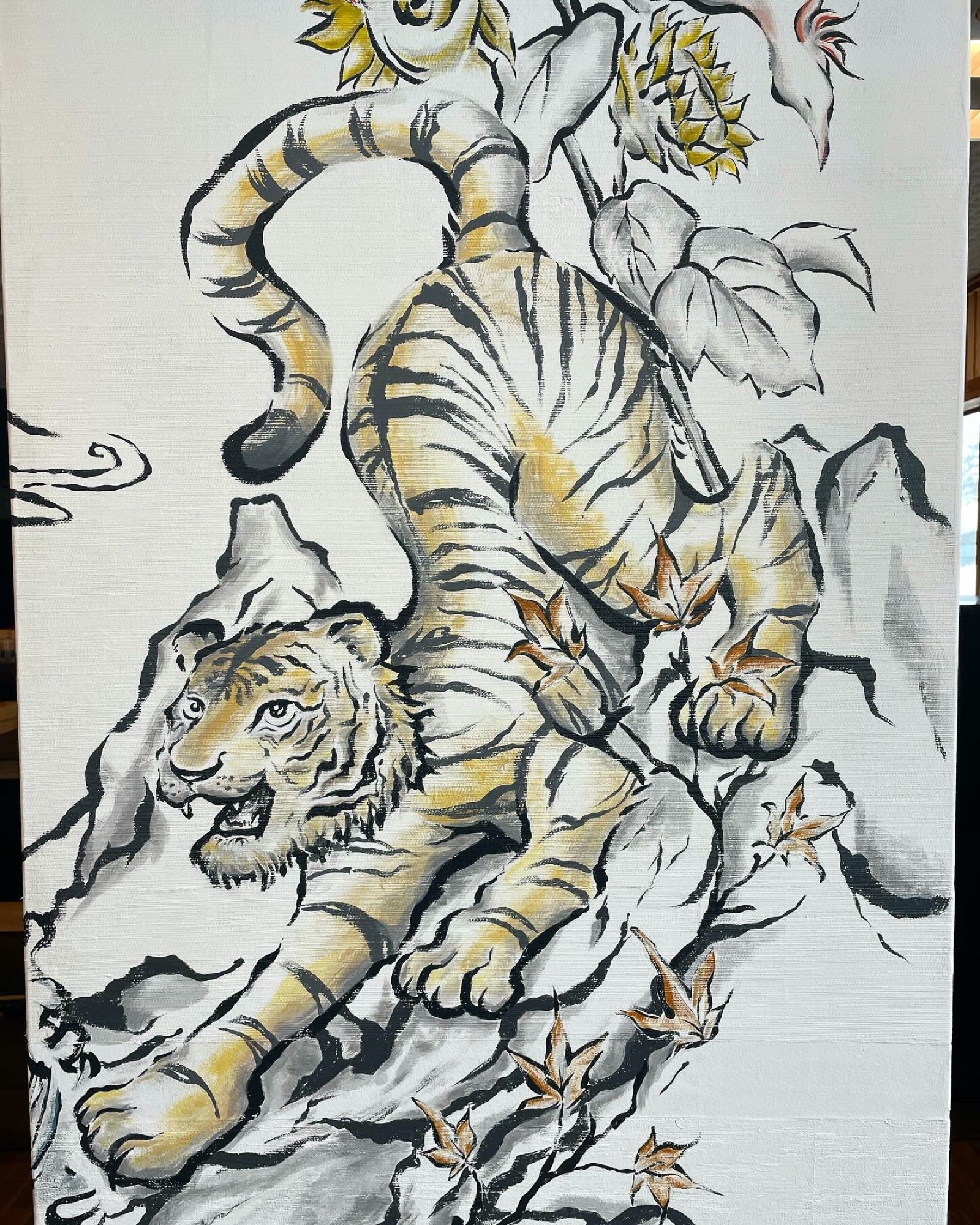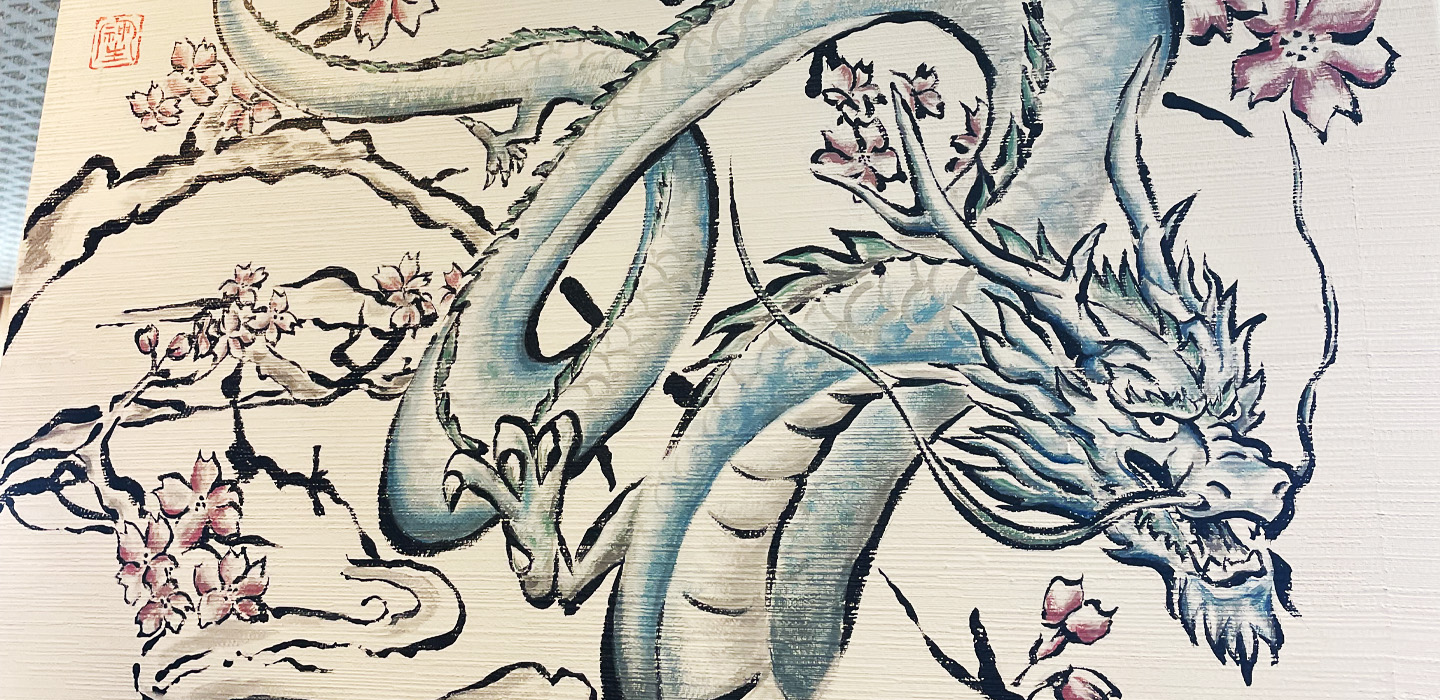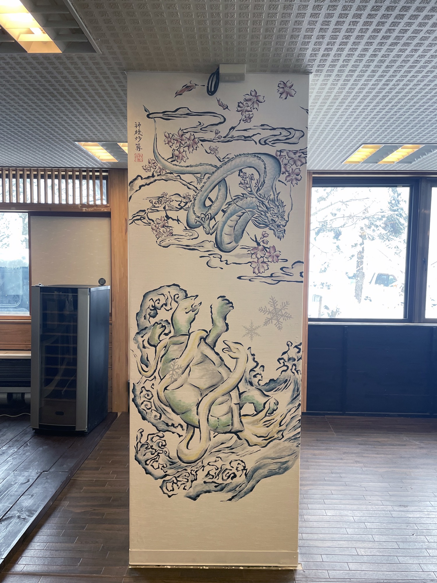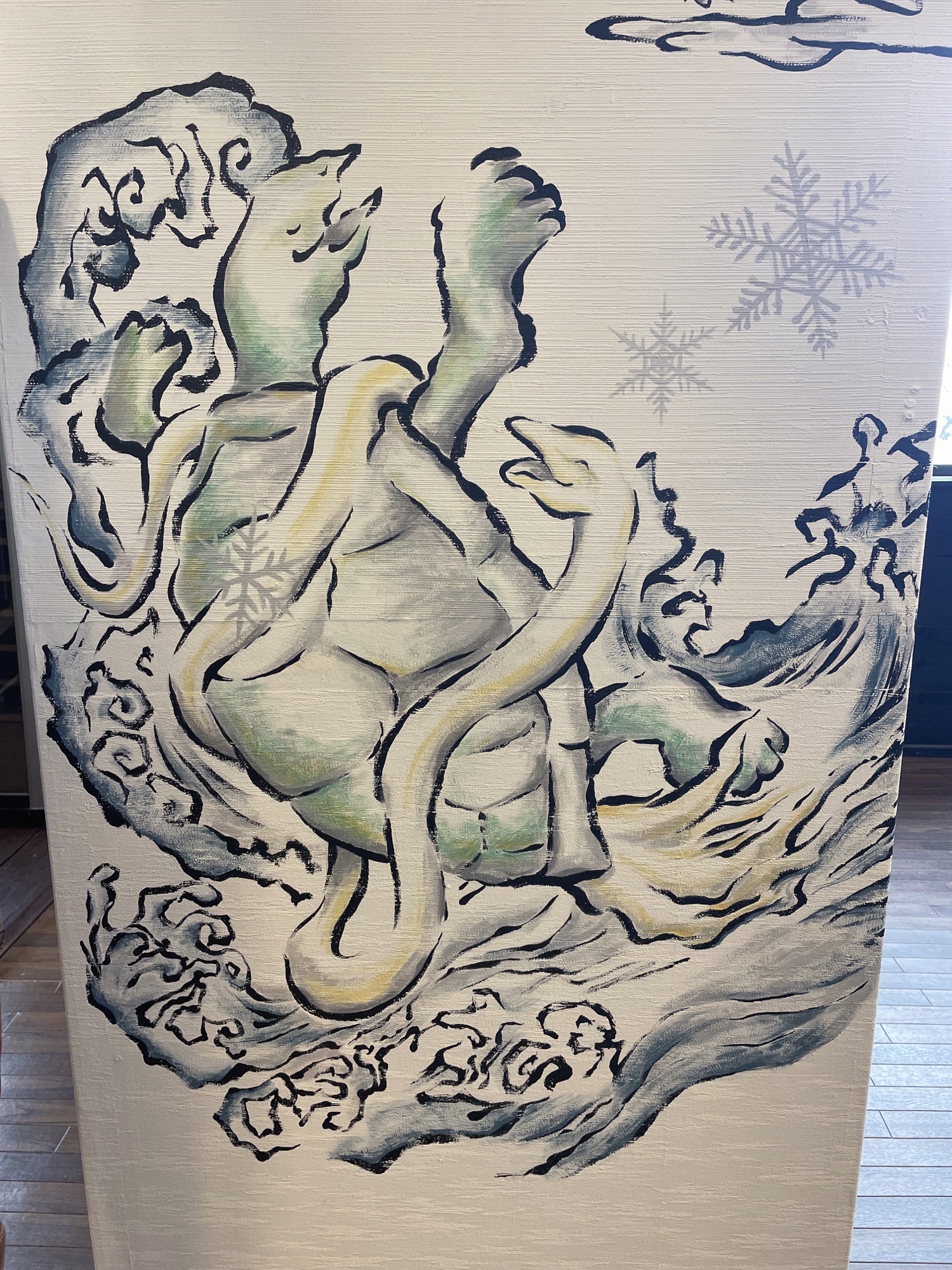 I painted a mural of the Four Divine Beasts inside the restaurant Fuga at SUMMIT VIEW HAKUBA in the Hakuba Happo area. On the northeast-facing wall, I placed Azure Dragon and Black Tortoise; on the southwest-facing wall, Vermilion Bird and White Tiger—balancing their seasonal attributes (spring and winter) so the space would feel energetically uplifted.