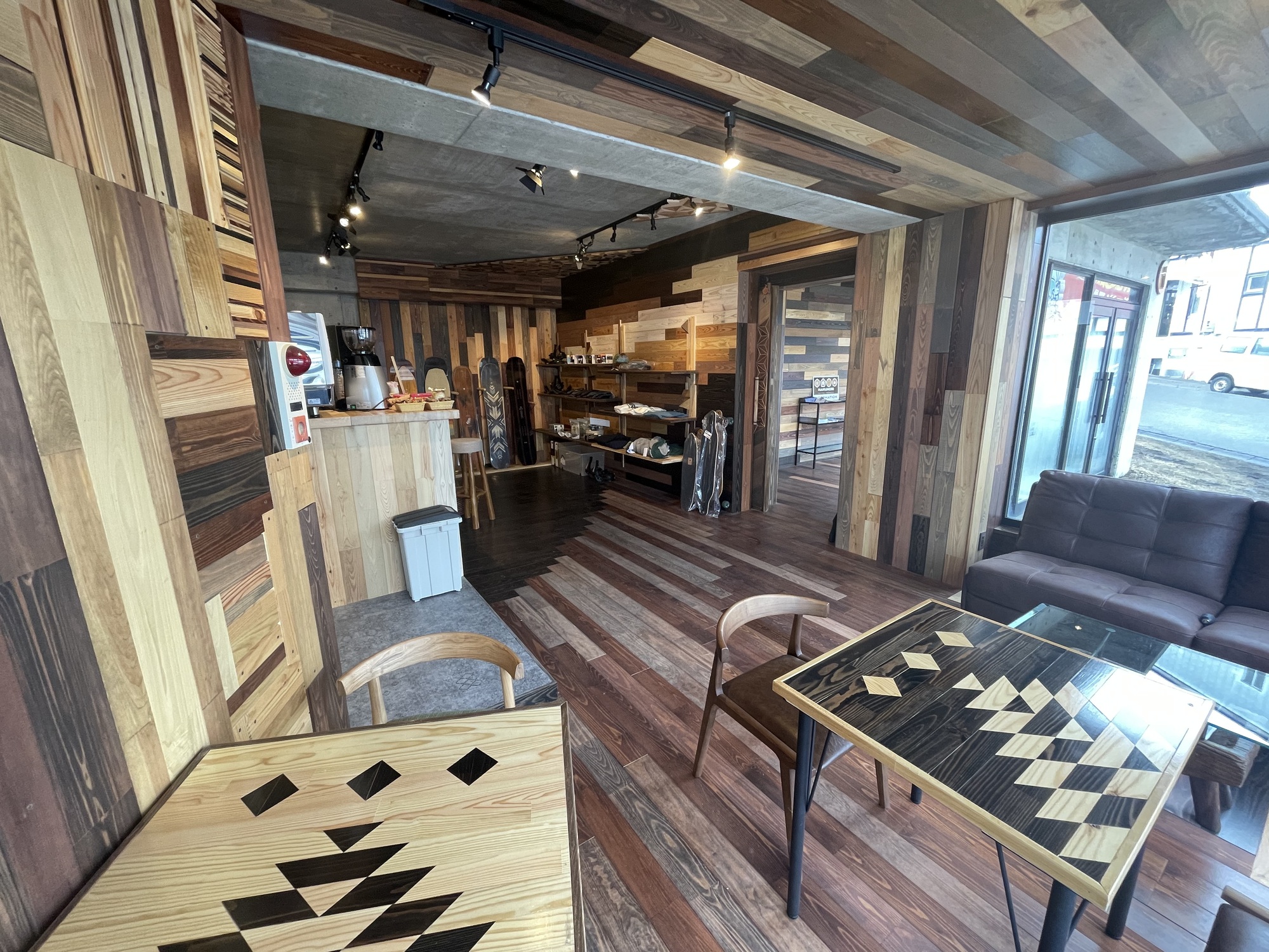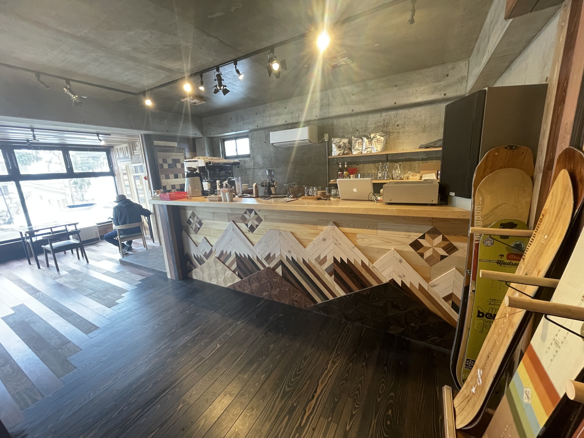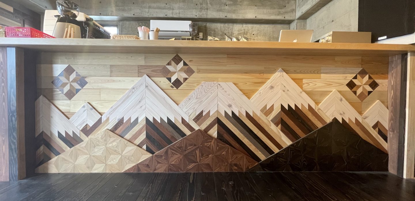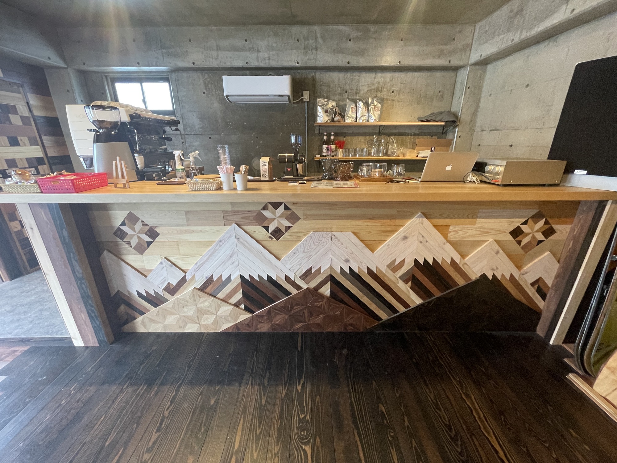 I was responsible for interior decoration at THE SATELLITE CAFE in Otari, Nagano. Beneath the counter I designed a motif of the Hakuba mountain range. While the floorboards use many different colors, I shaped the space to feel cohesive and calm.