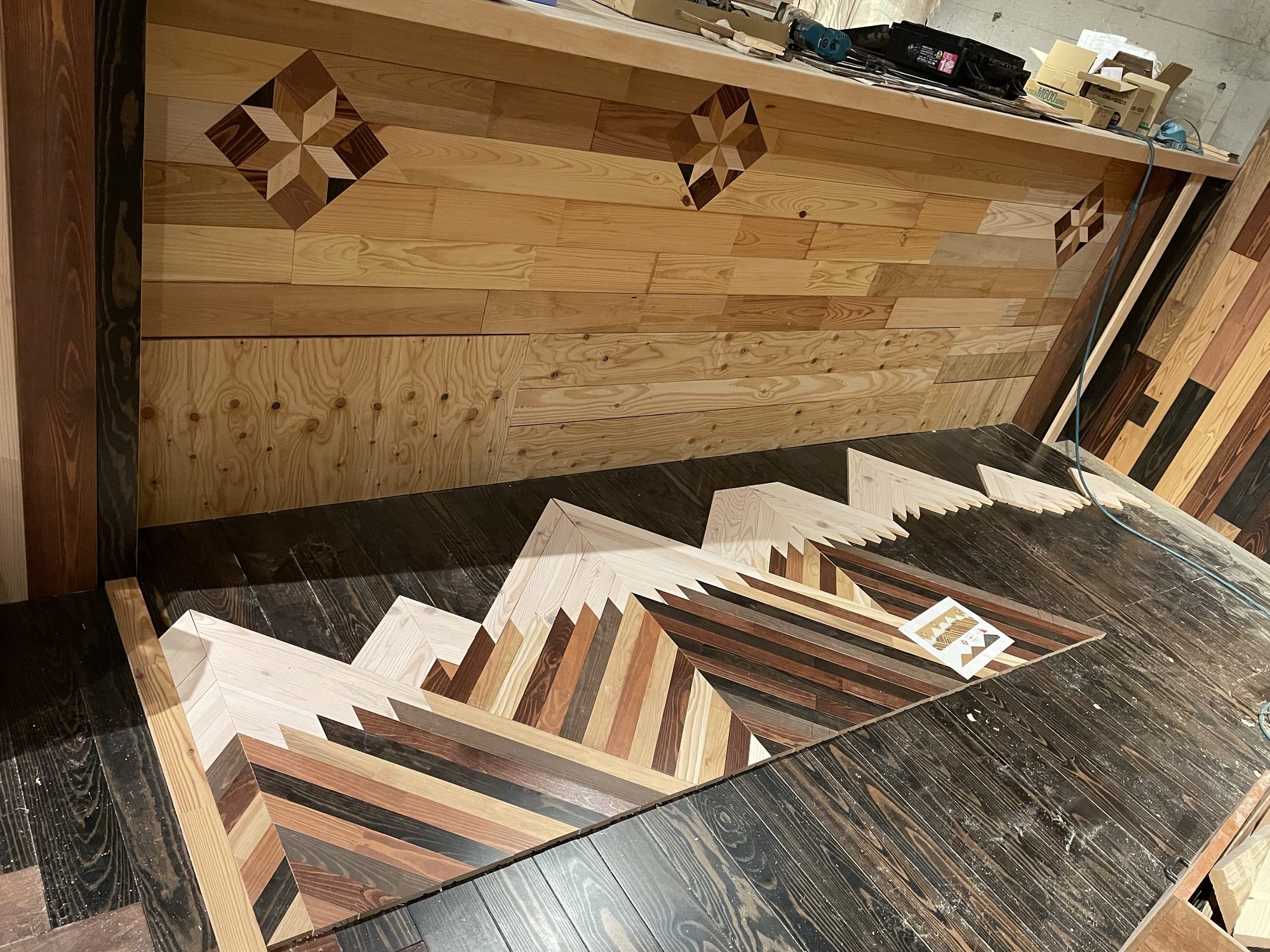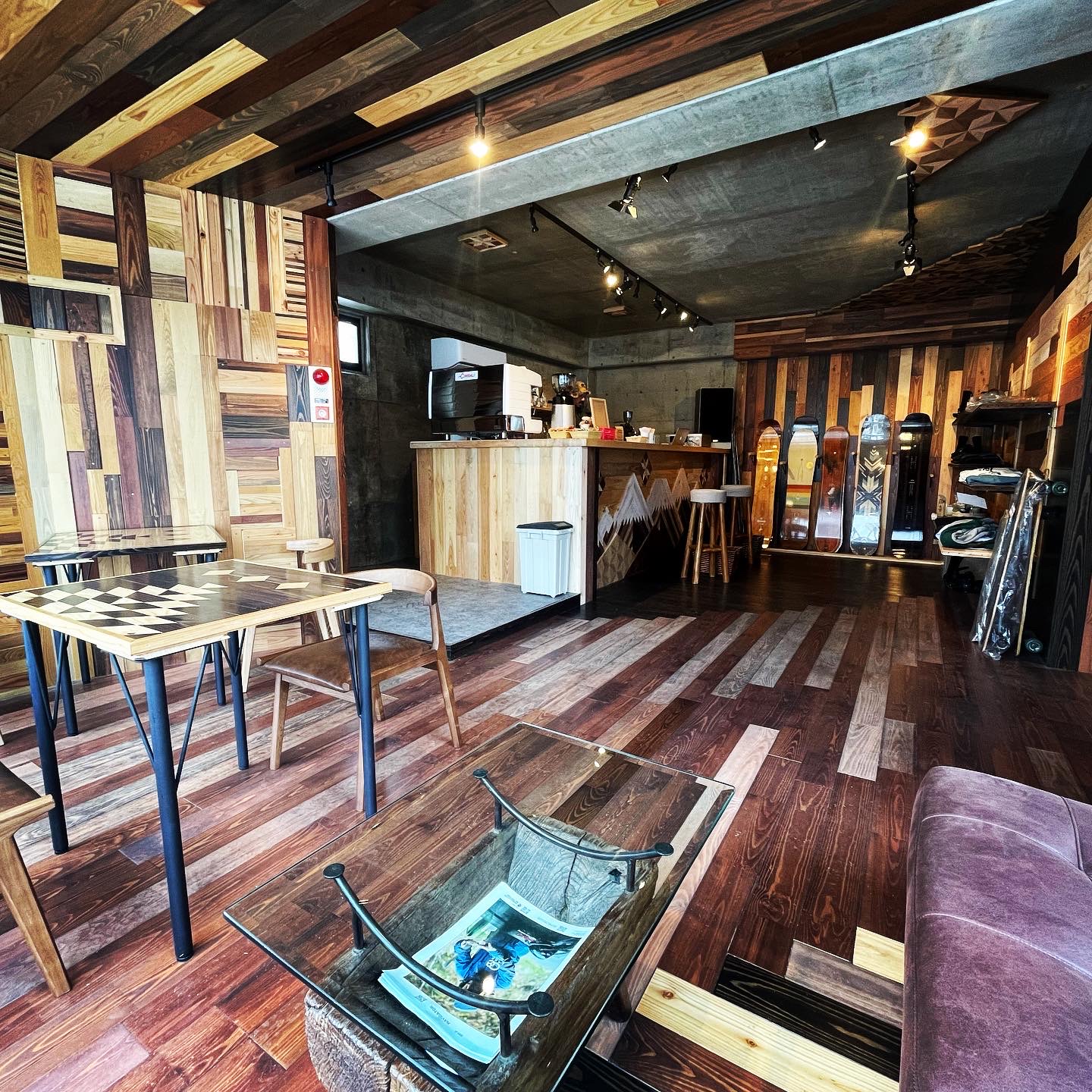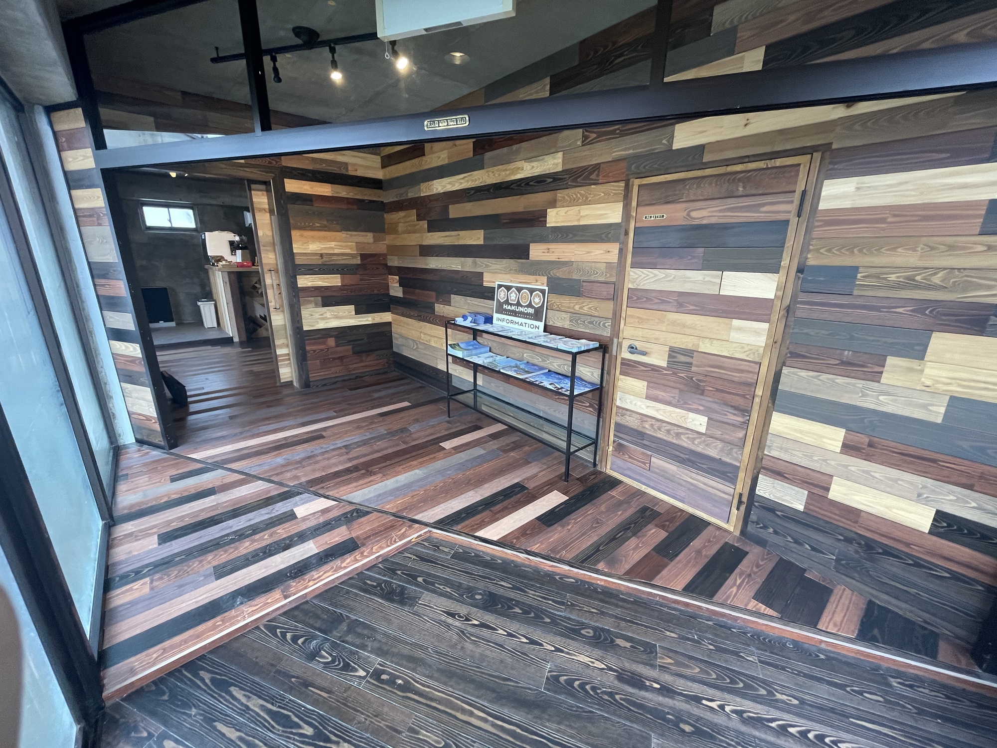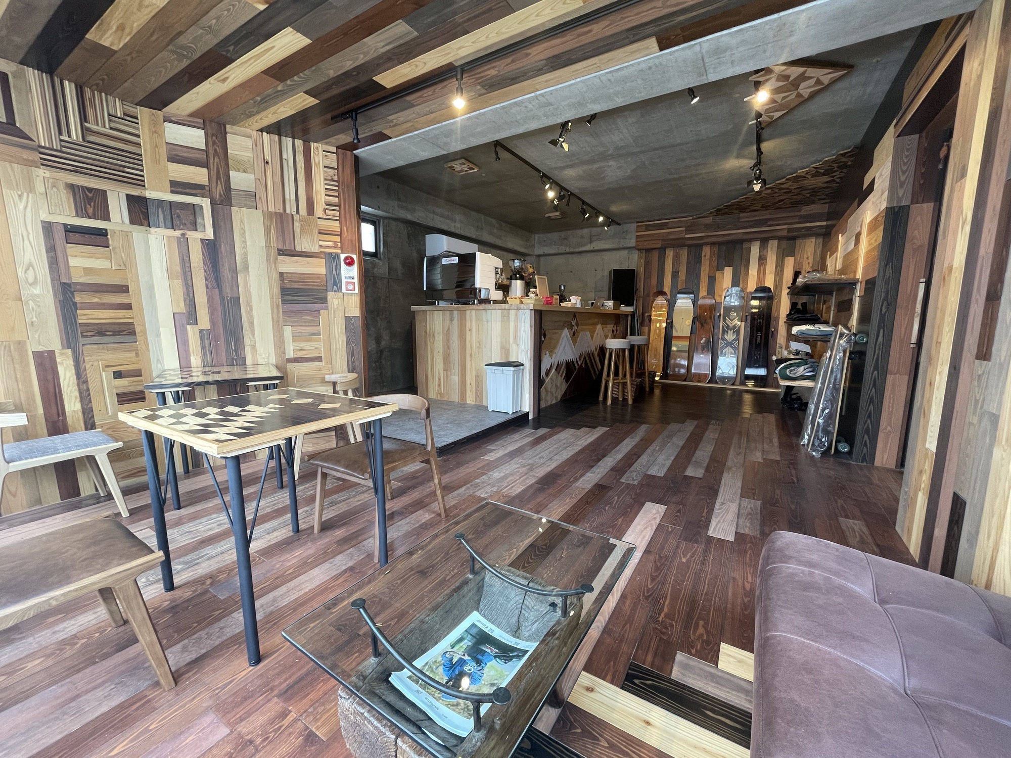 I was responsible for interior decoration at THE SATELLITE CAFE in Otari, Nagano. Beneath the counter I designed a motif of the Hakuba mountain range. While the floorboards use many different colors, I shaped the space to feel cohesive and calm.