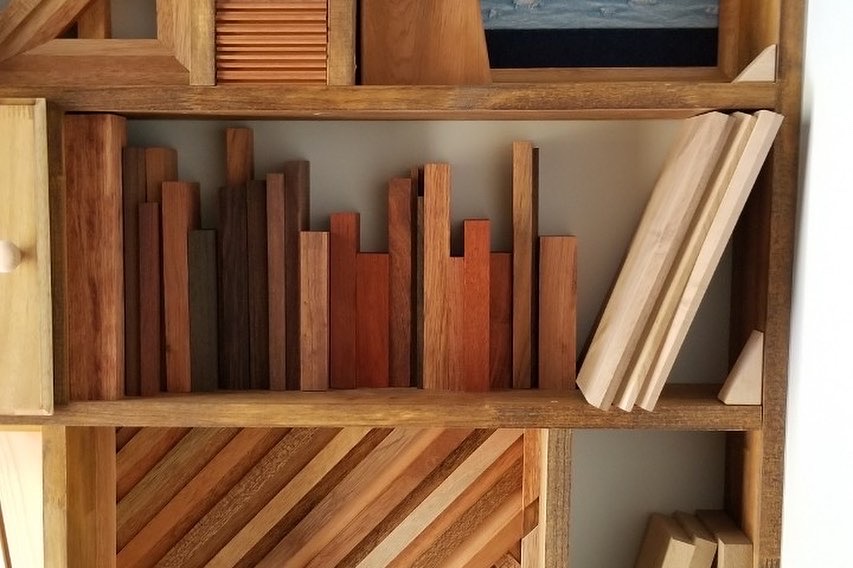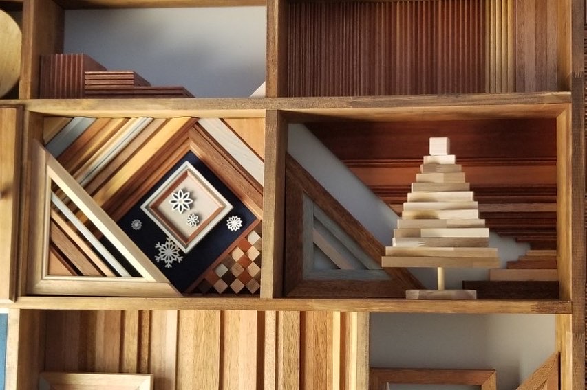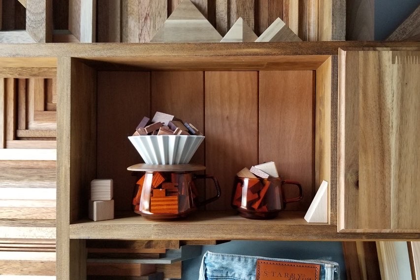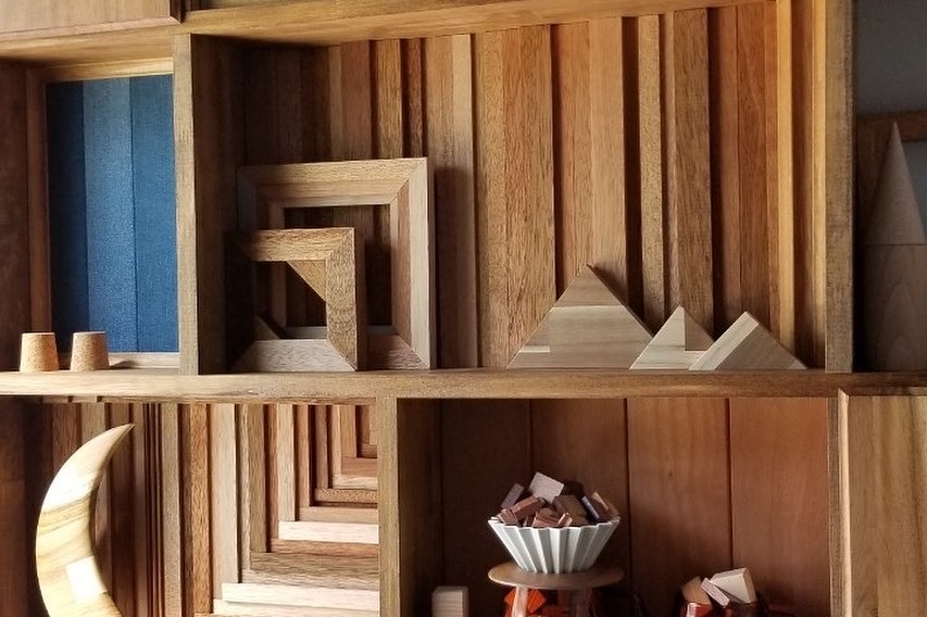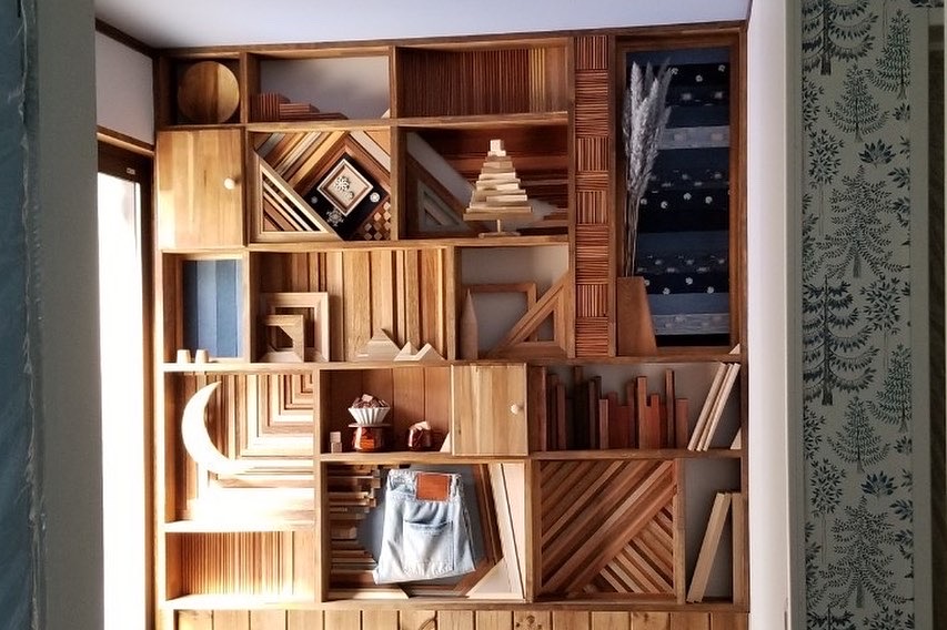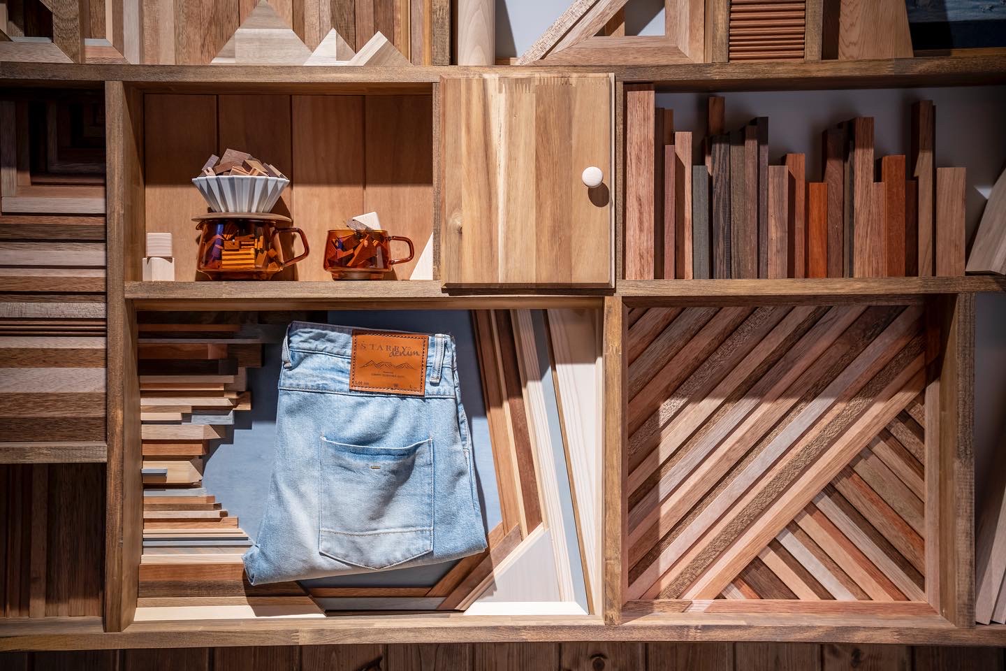For STARRYdenim, a private rental lodge at Happo-One Ski Resort in Hakuba, Nagano, I created display shelves for the stair landing. Each shelf has a different design… I also drew inspiration from the lodge’s name—denim—adding custom-designed denim leather patches as decorative elements.