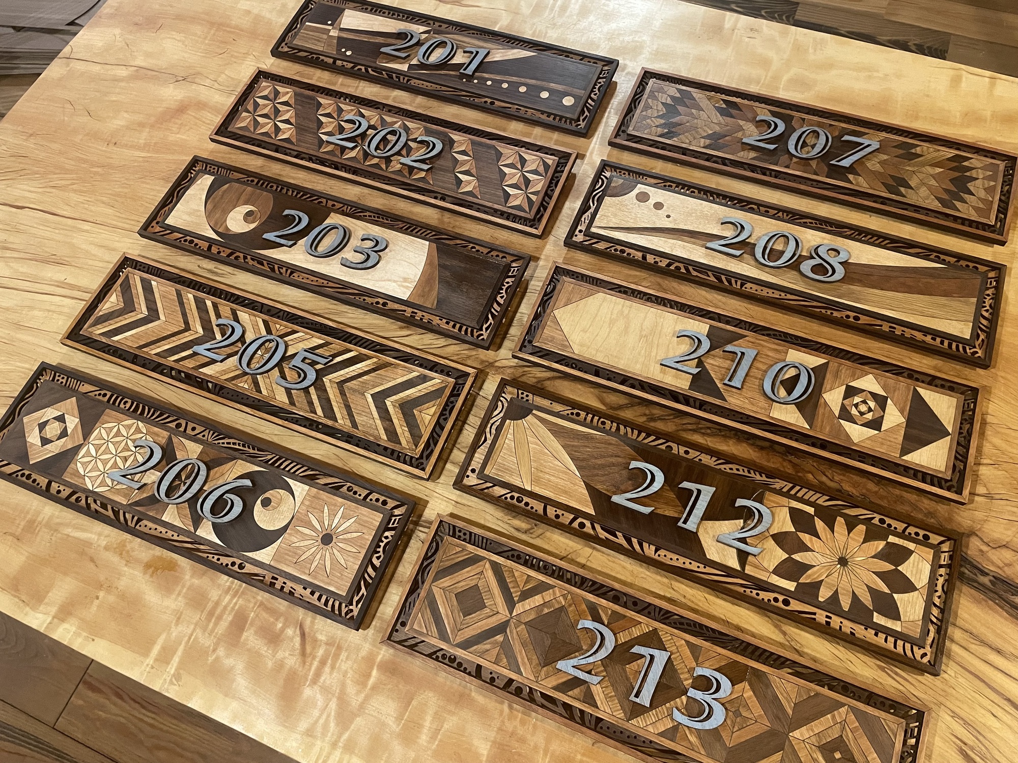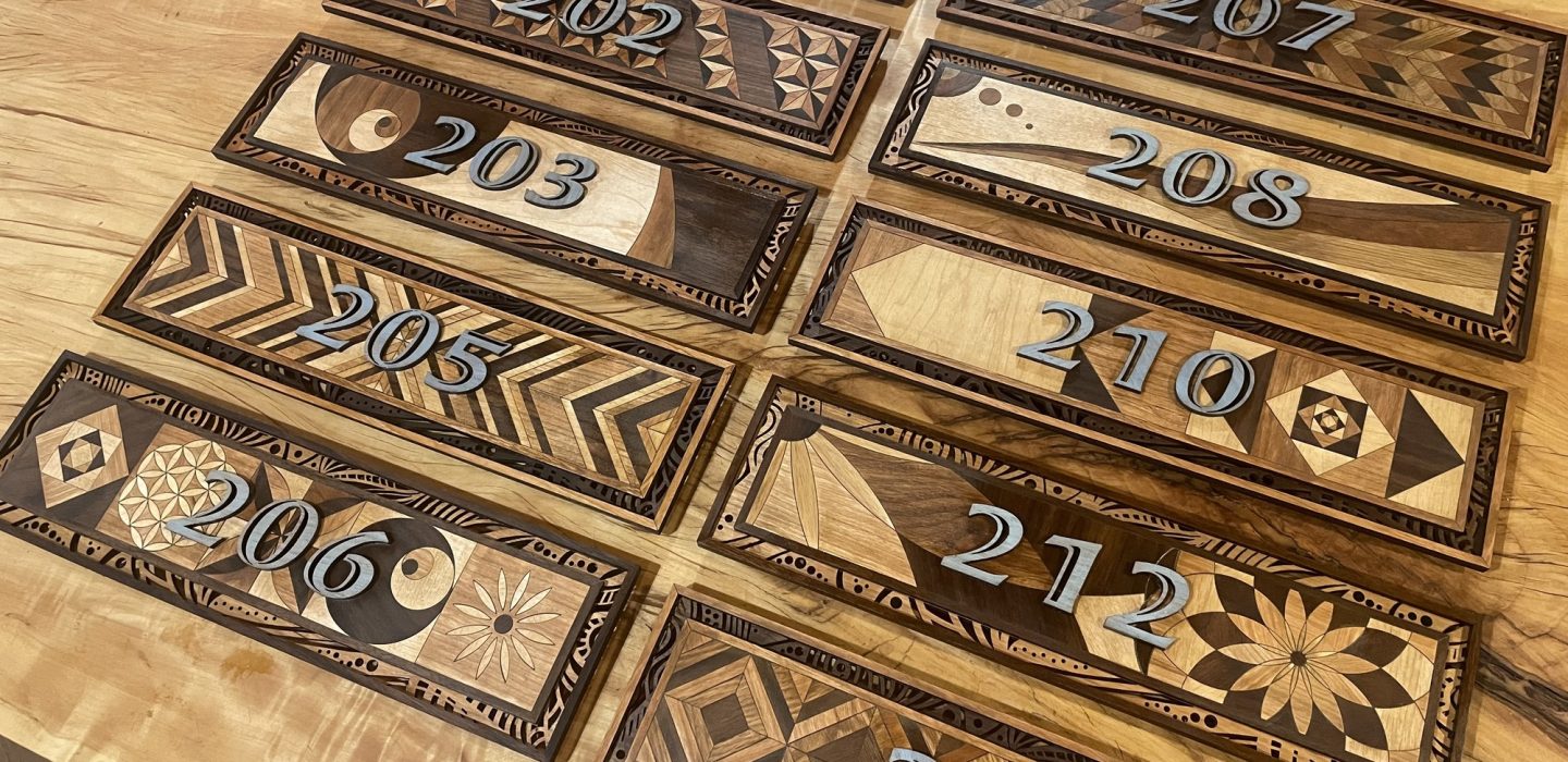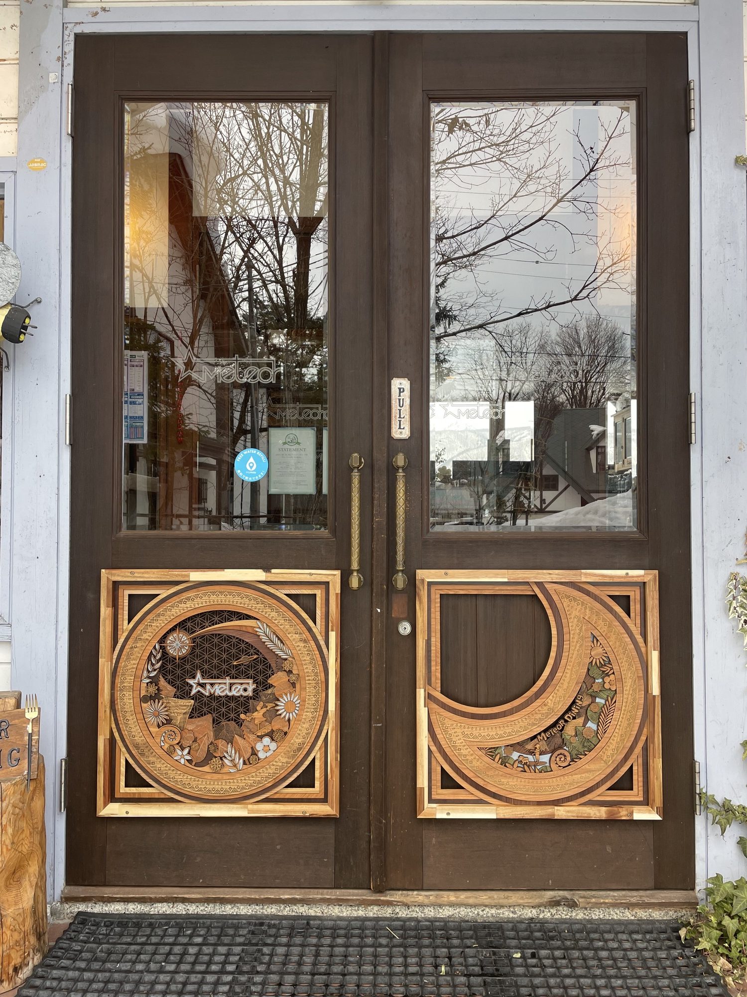 For the lodging facility Meteor in Hakuba, Nagano, I created the entrance-door decoration, room-number plates, and a hanger rack.