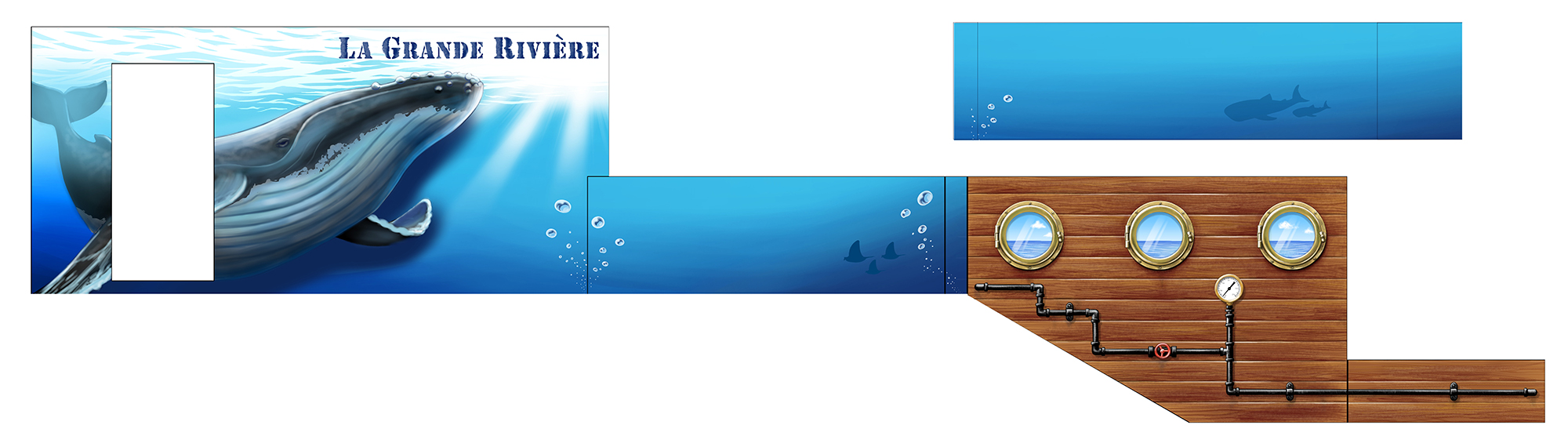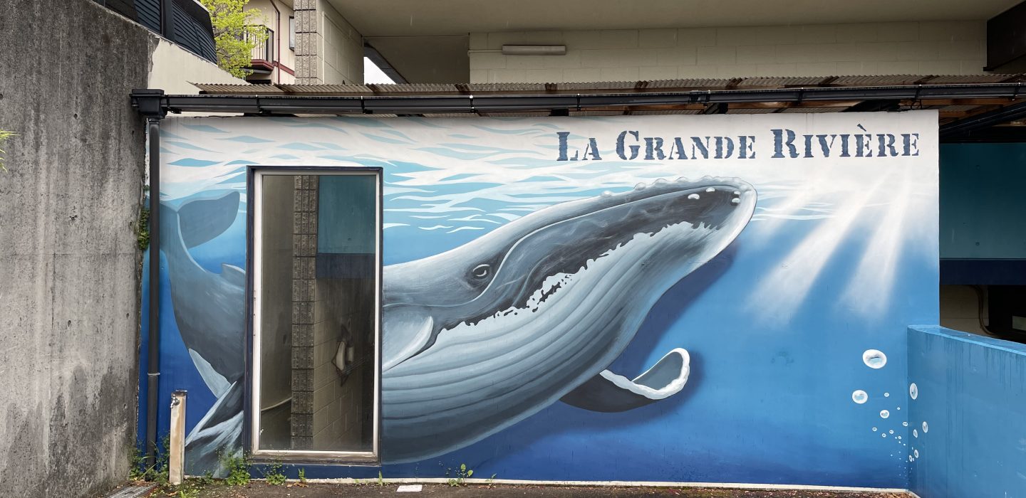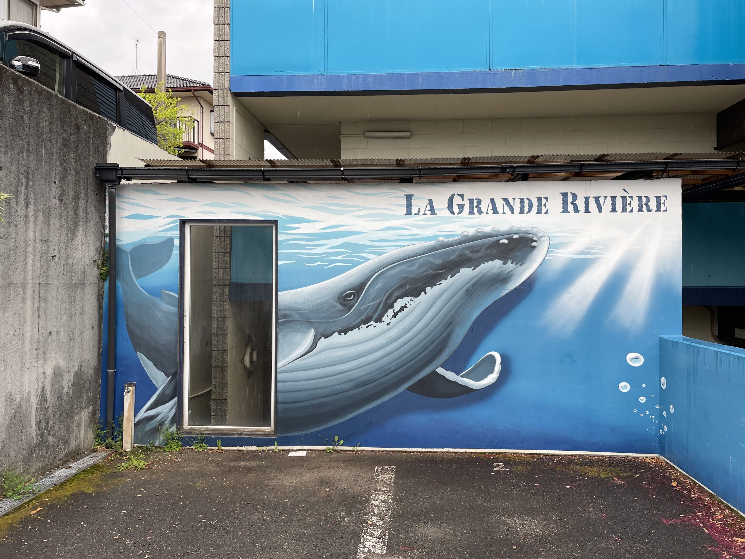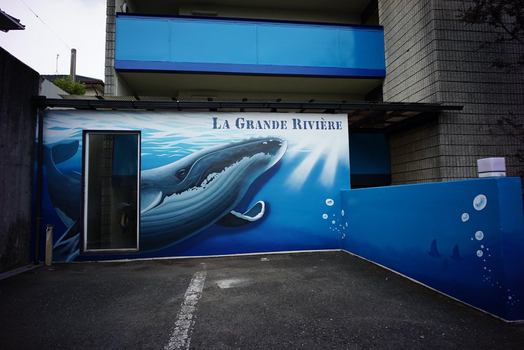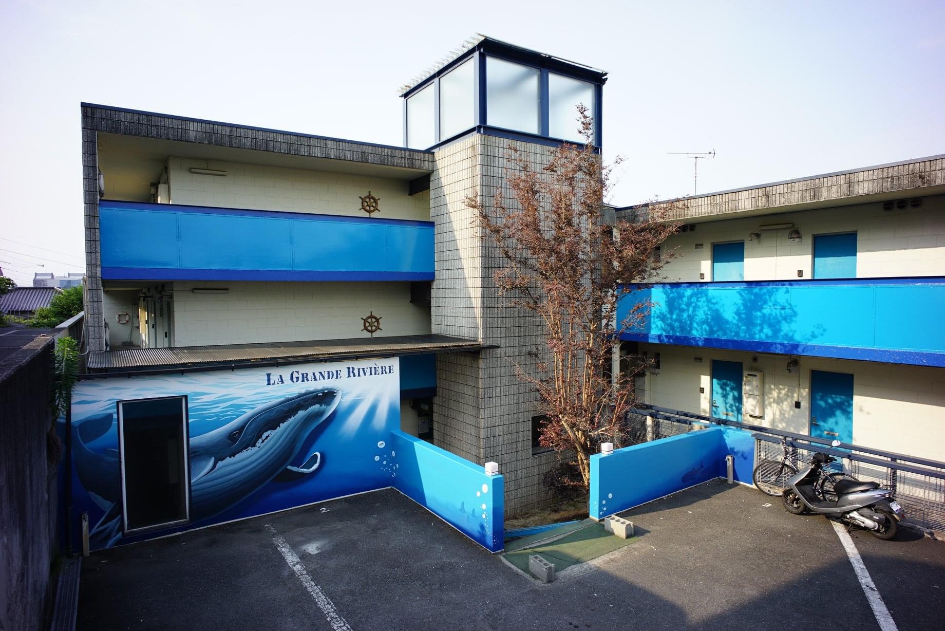 I painted a mural on the exterior wall of the monthly apartment La-Grande-Riviere in Kurume, Fukuoka, with imagery inspired by whales, rays, and the deck of a ship.