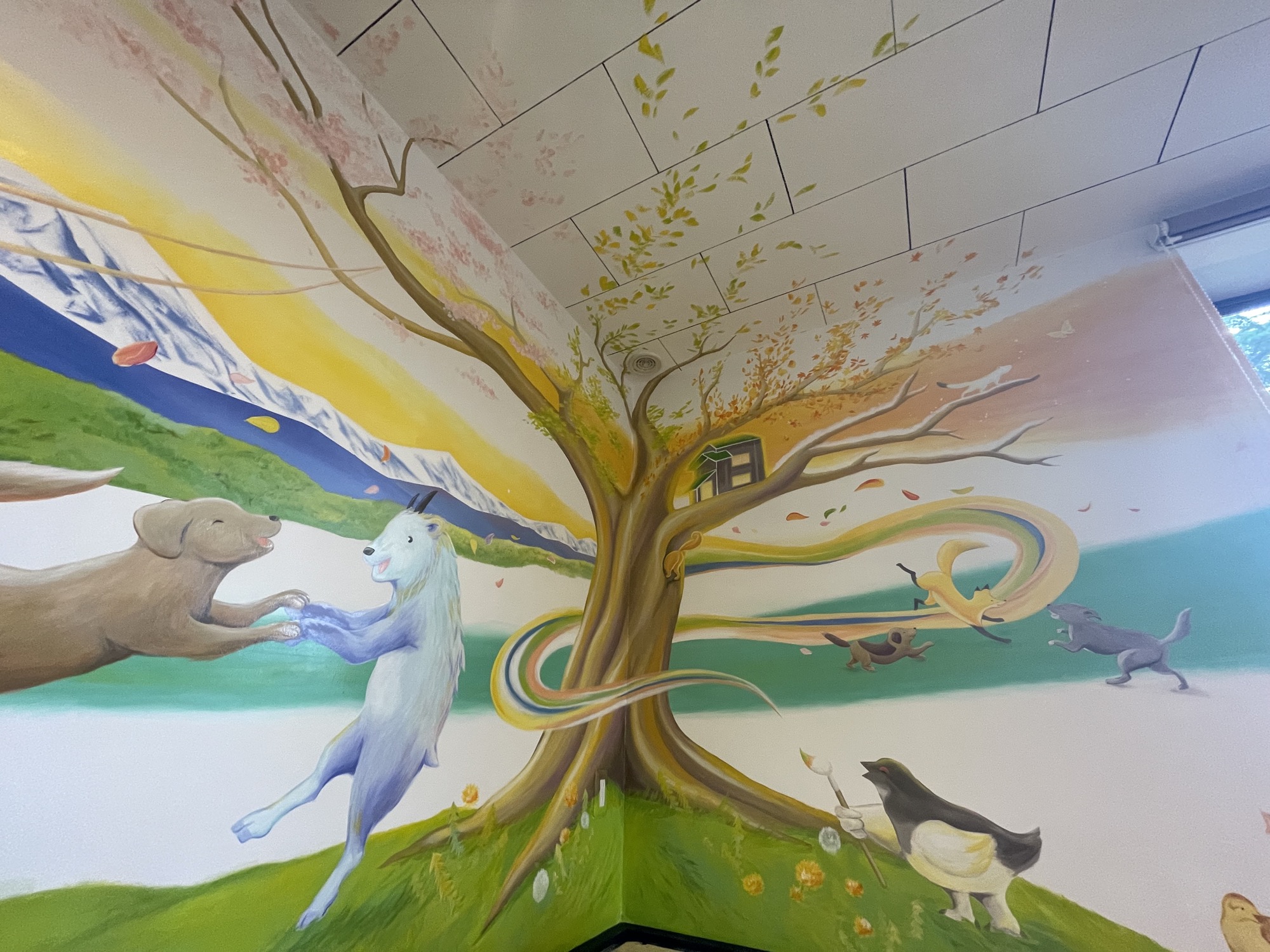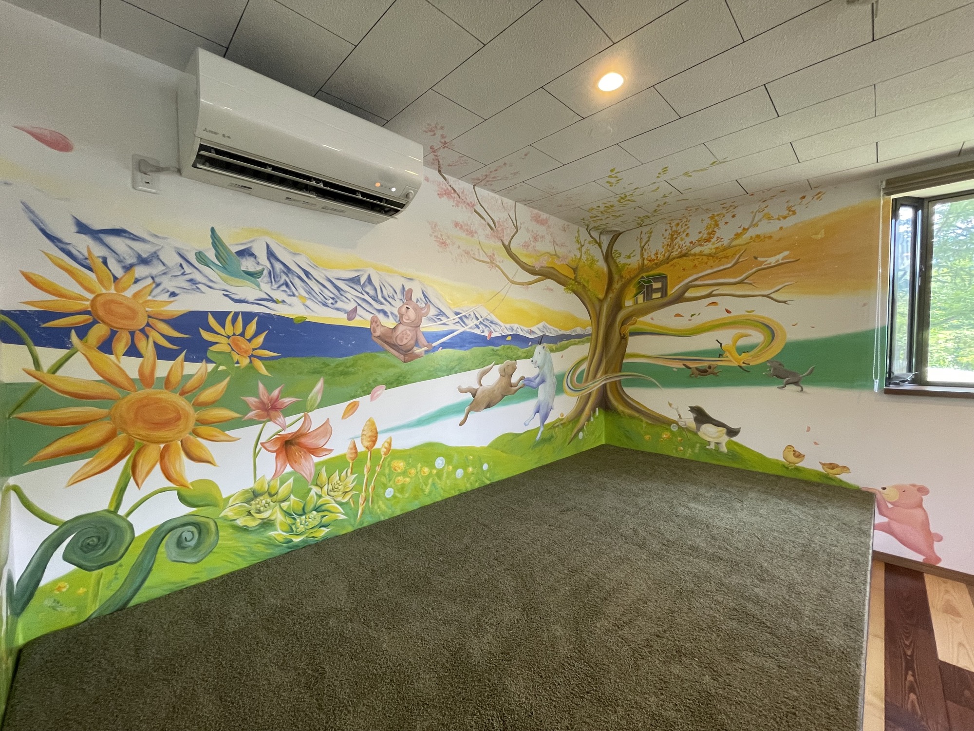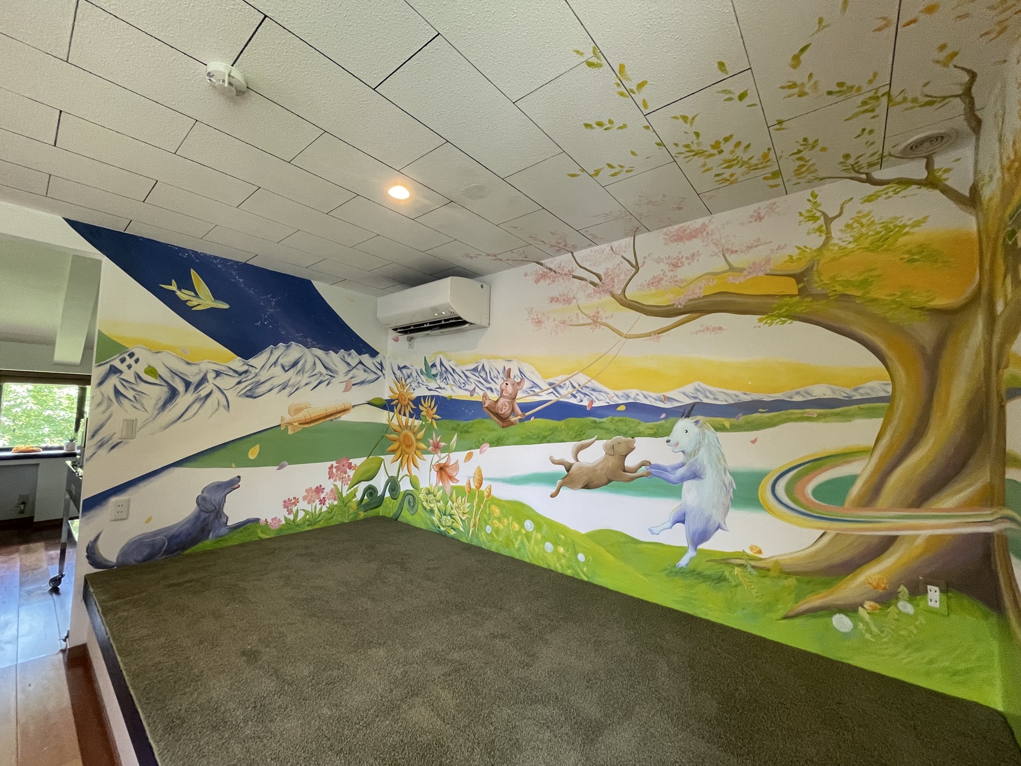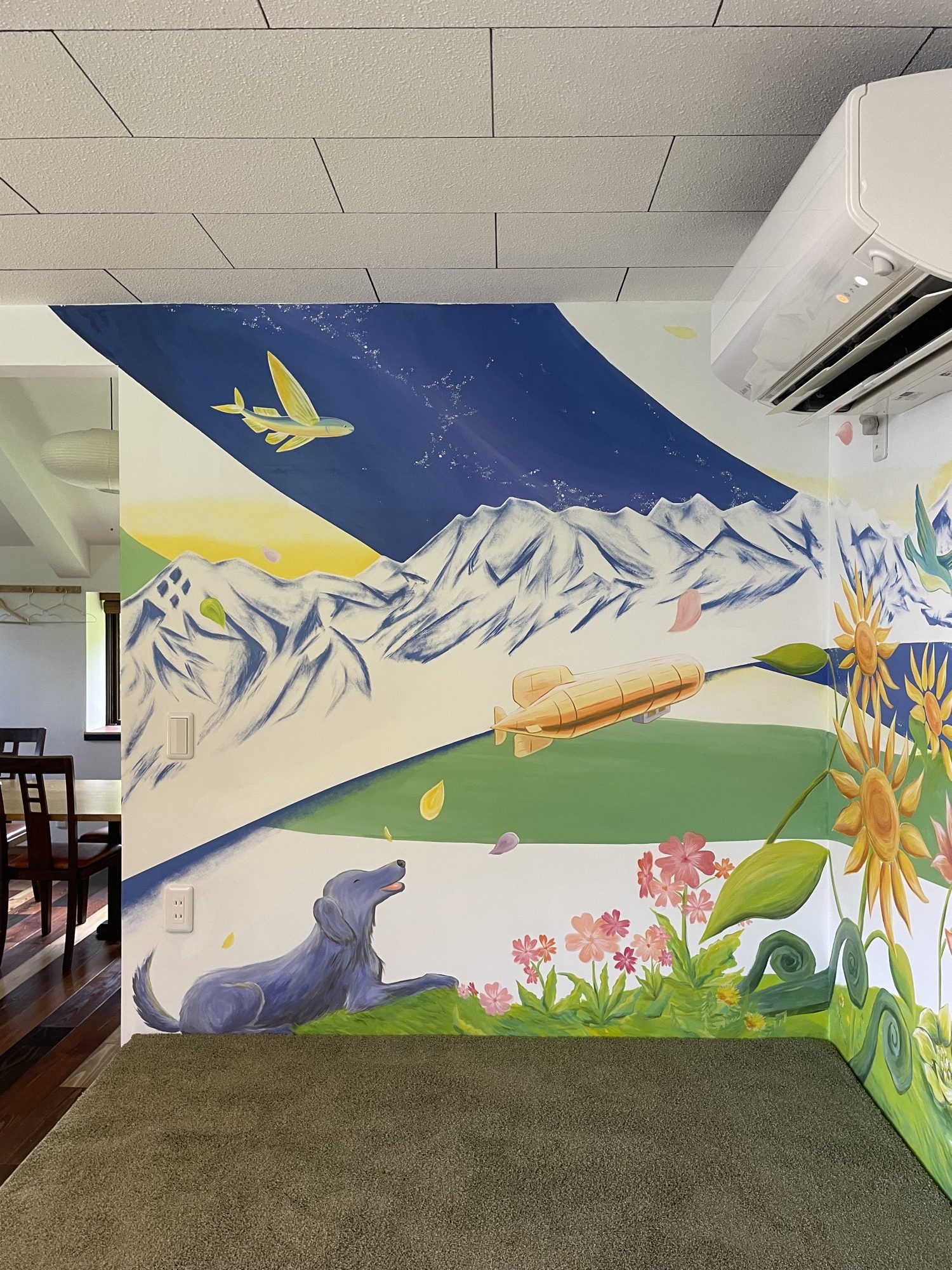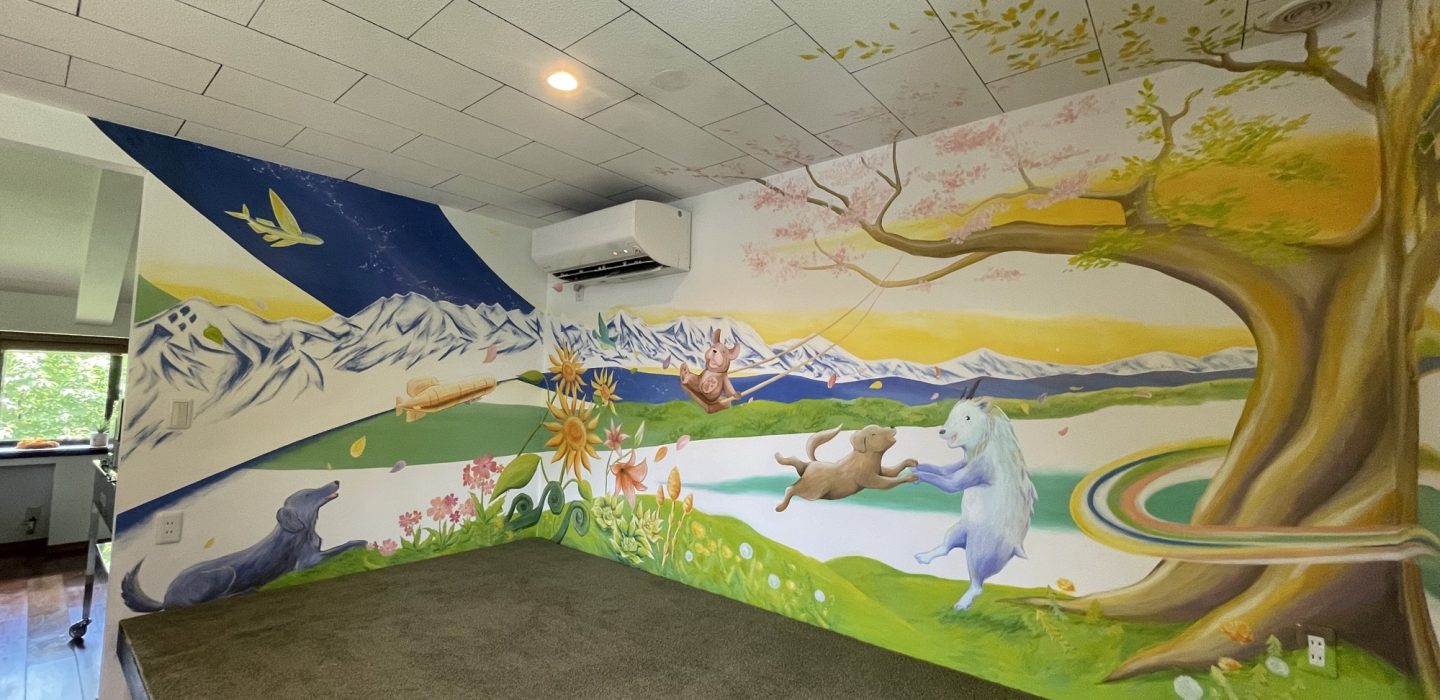 At HIeDa Lodge at Cortina Ski Resort, I painted several murals. I depicted many animals and plants—including the owner’s six dogs and three cats—along with the Northern Alps. Painting three living-room walls plus the ceiling was challenging, but I believe it created a strong and memorable spatial effect.