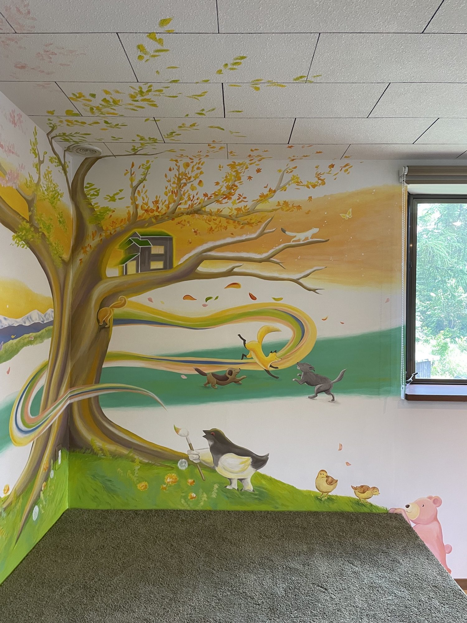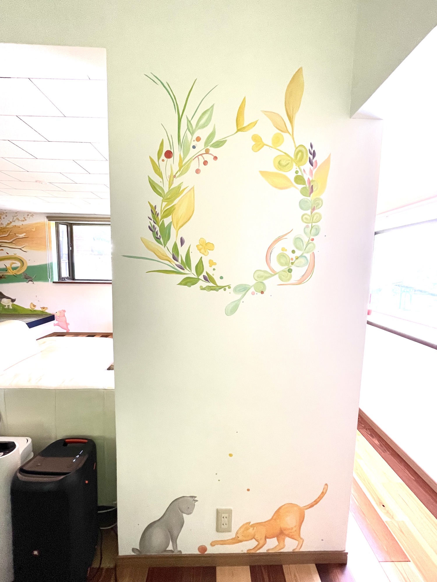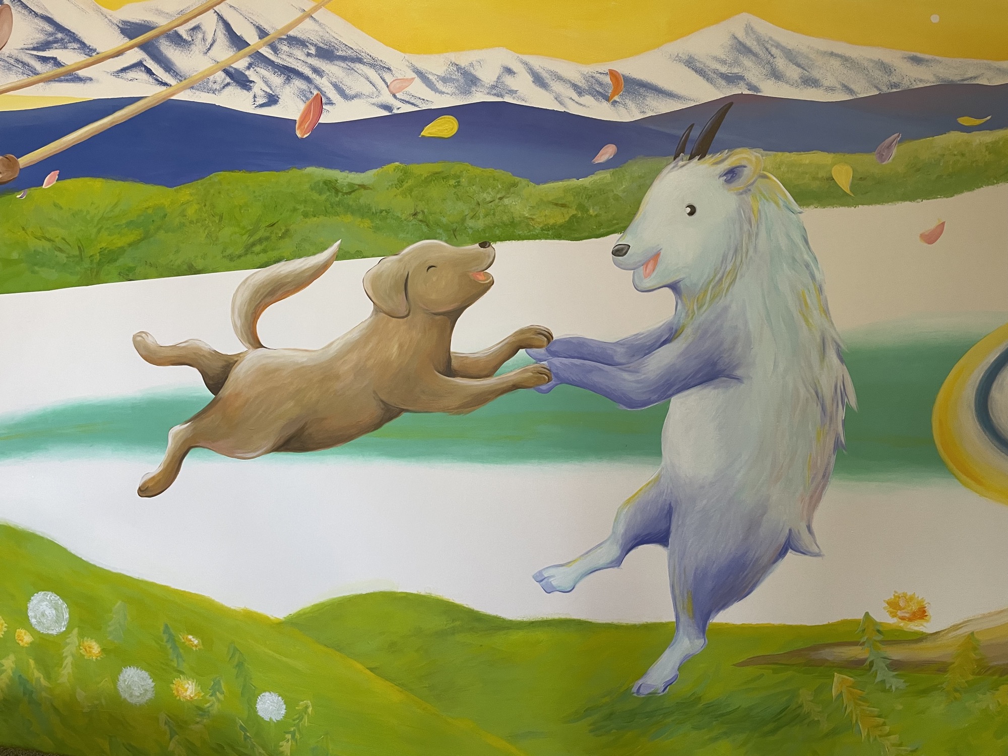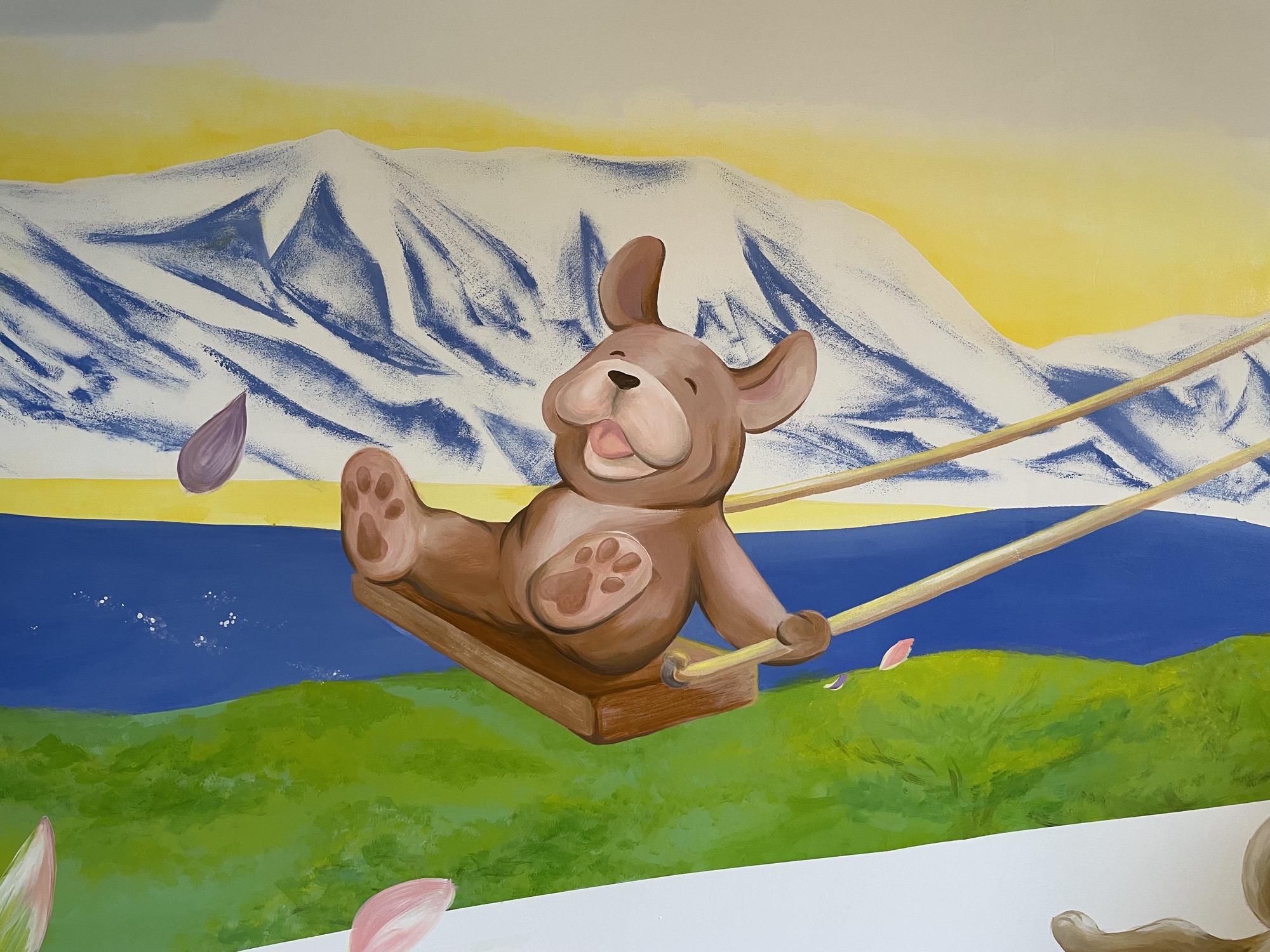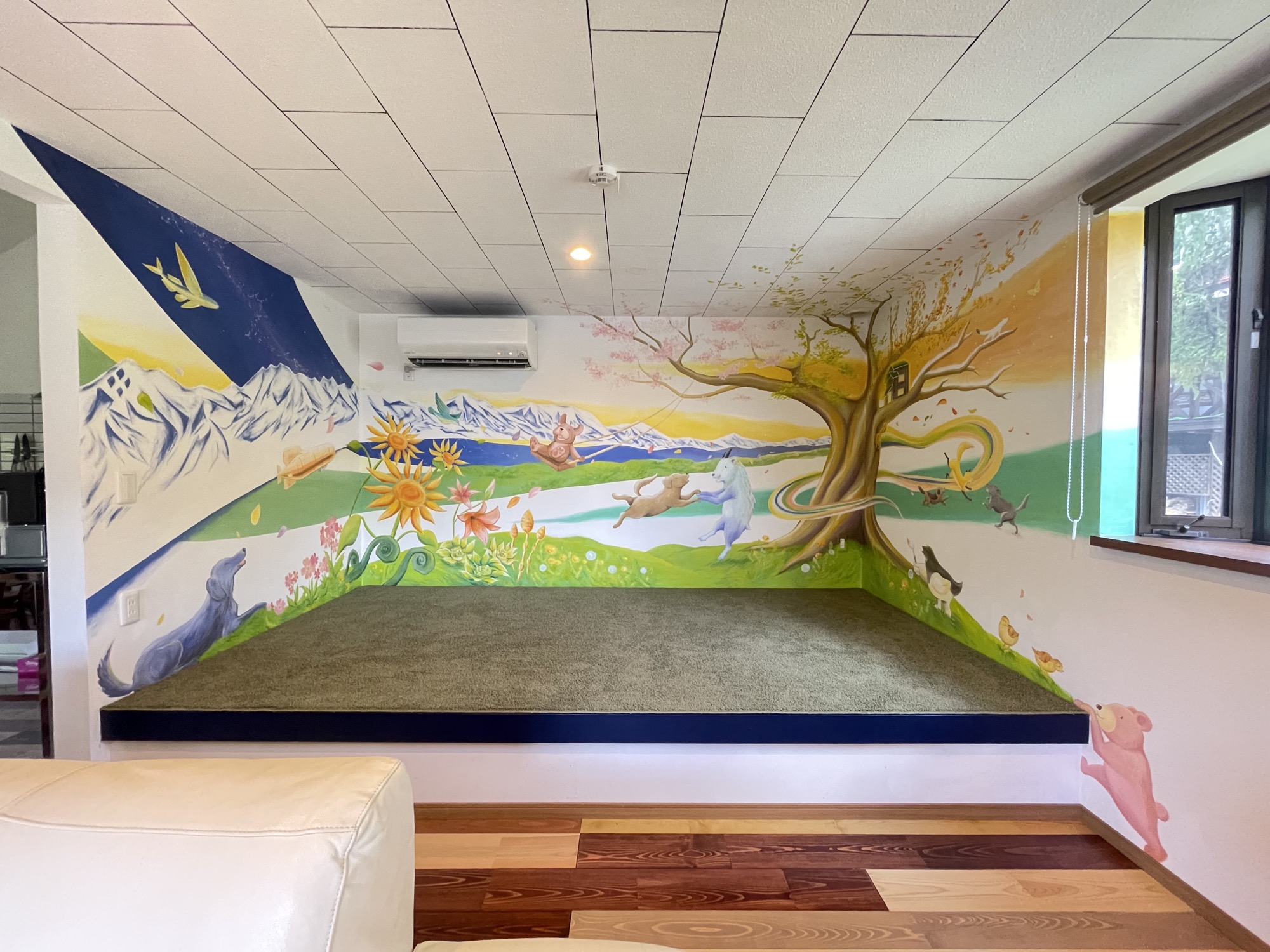 At HIeDa Lodge at Cortina Ski Resort, I painted several murals. I depicted many animals and plants—including the owner’s six dogs and three cats—along with the Northern Alps. Painting three living-room walls plus the ceiling was challenging, but I believe it created a strong and memorable spatial effect.