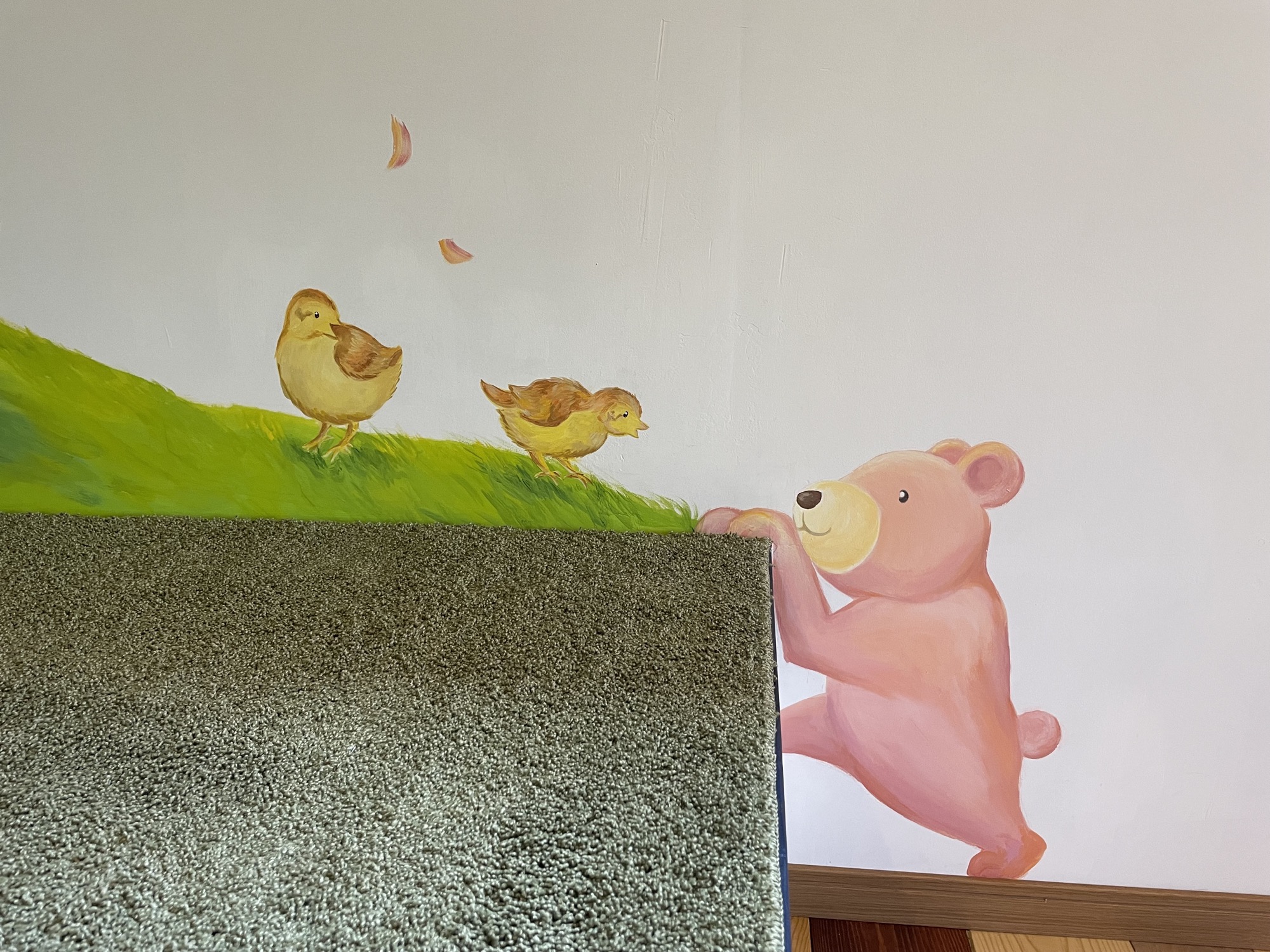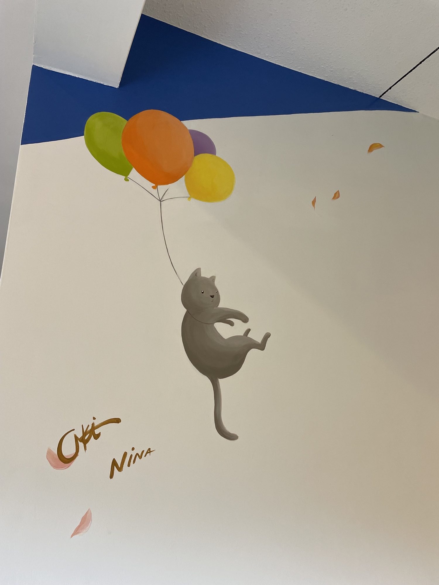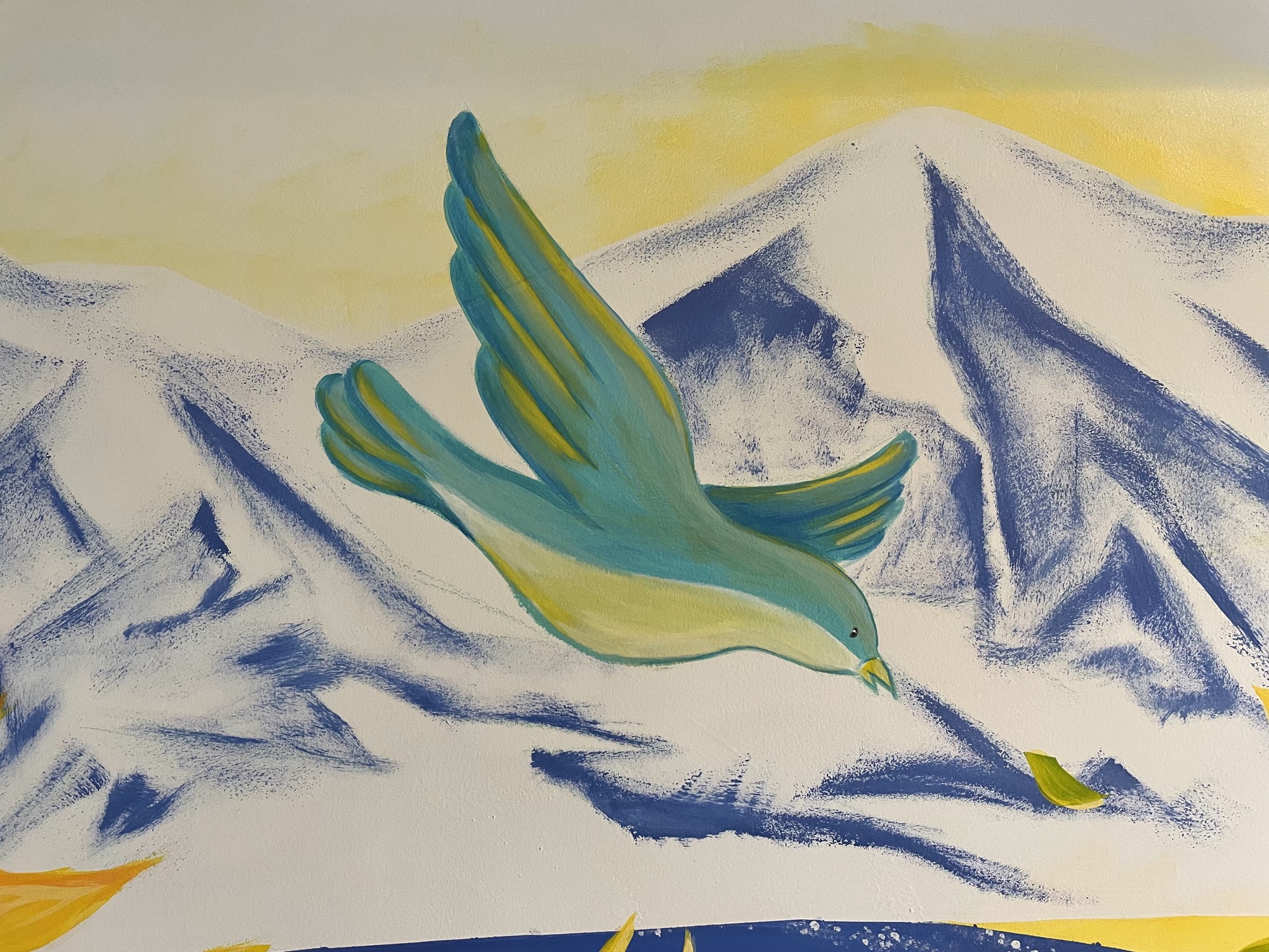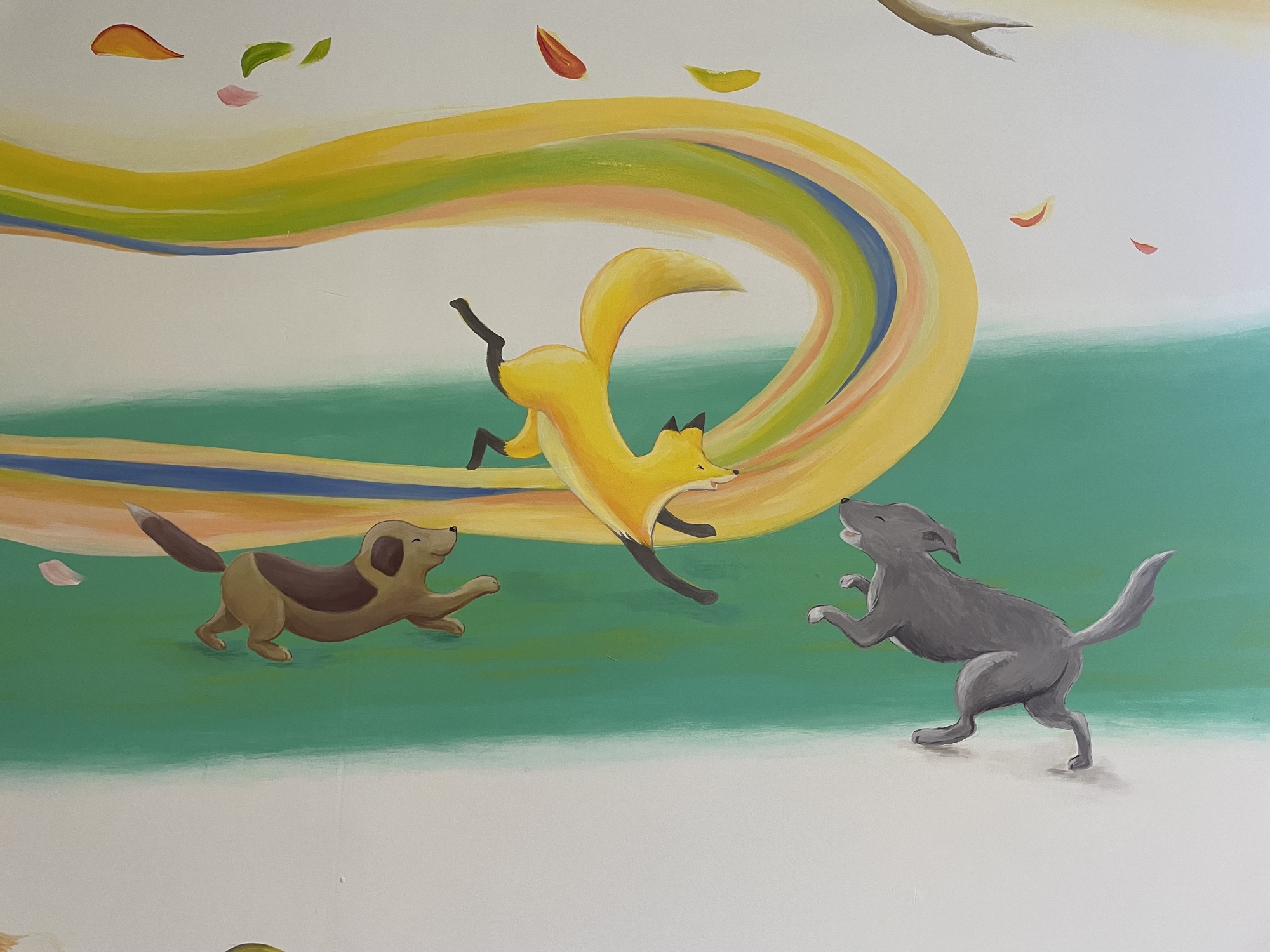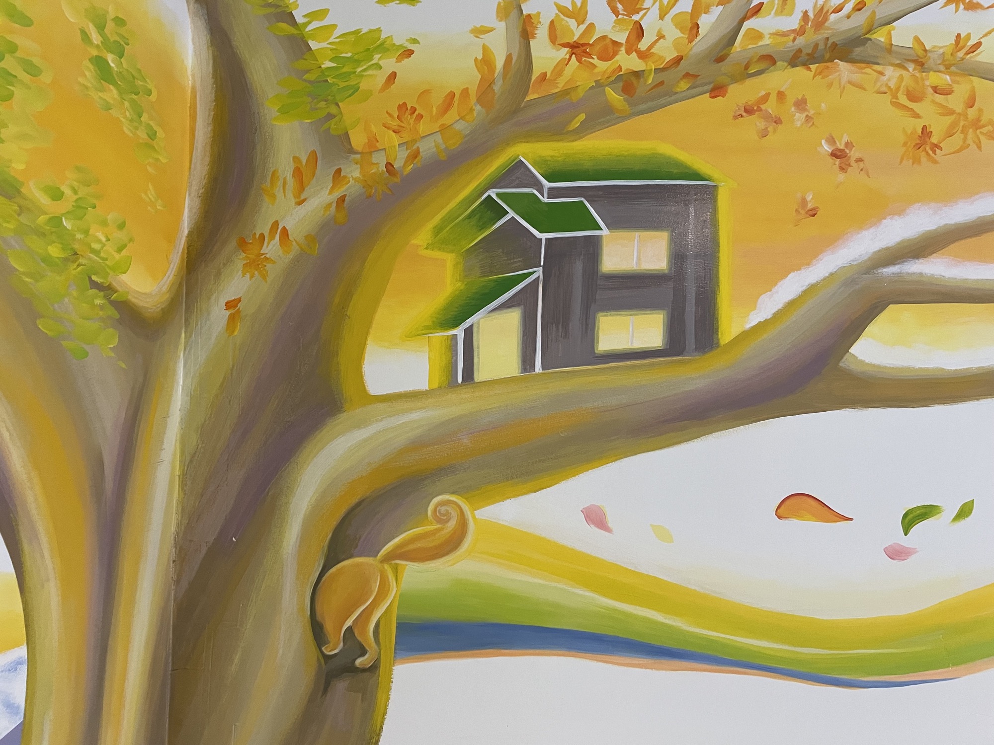At HIeDa Lodge at Cortina Ski Resort, I painted several murals. I depicted many animals and plants—including the owner’s six dogs and three cats—along with the Northern Alps. Painting three living-room walls plus the ceiling was challenging, but I believe it created a strong and memorable spatial effect.