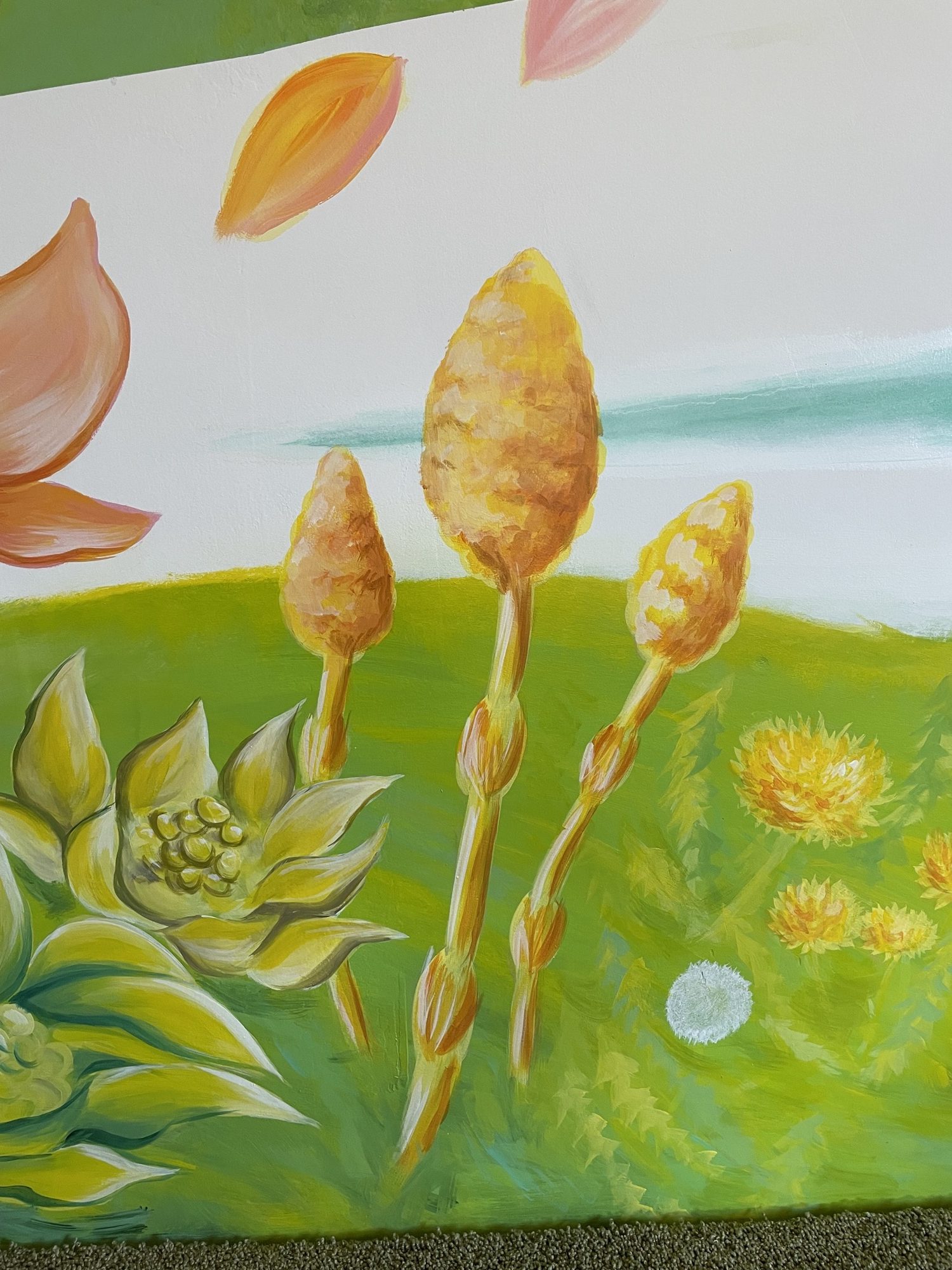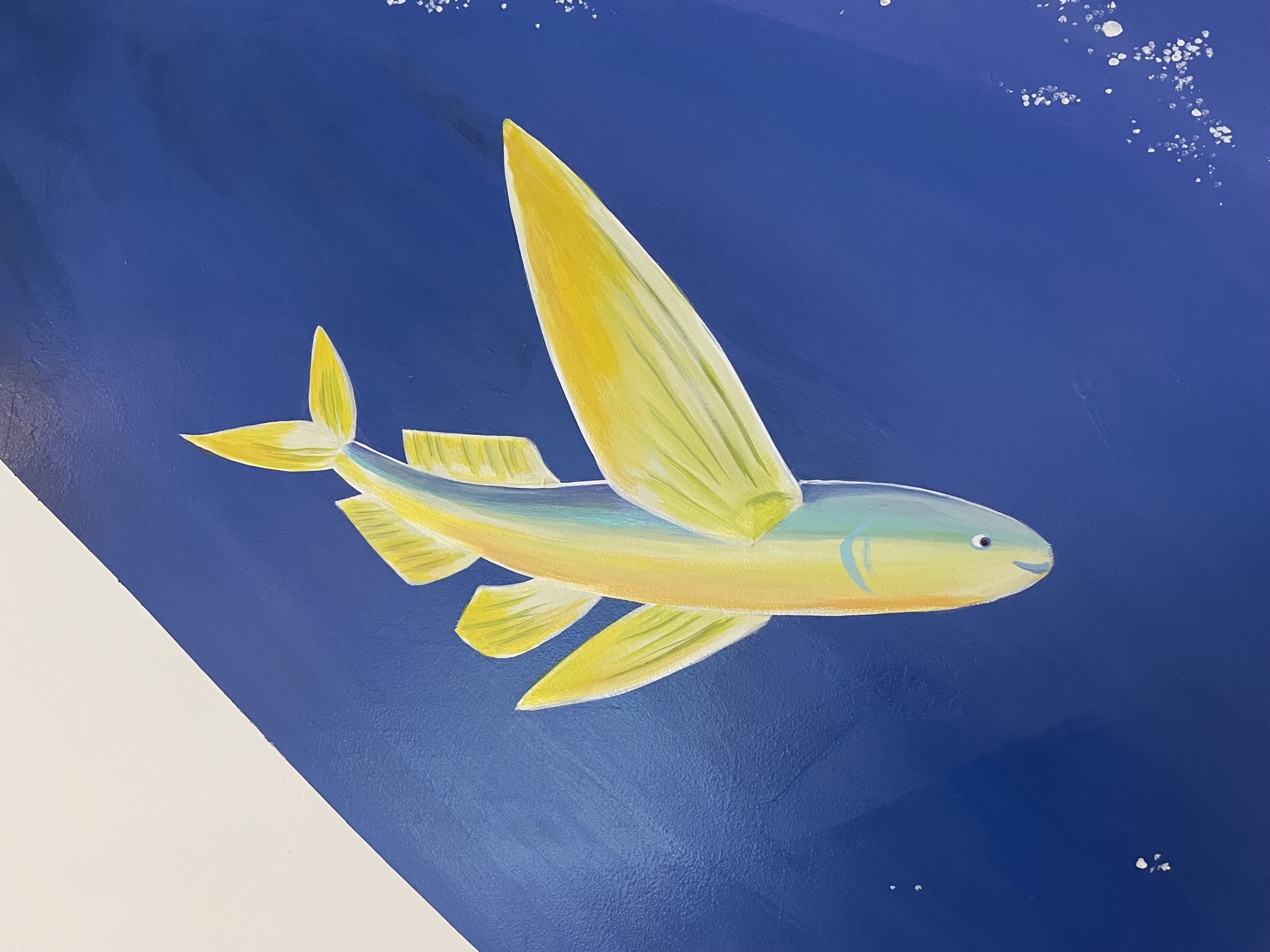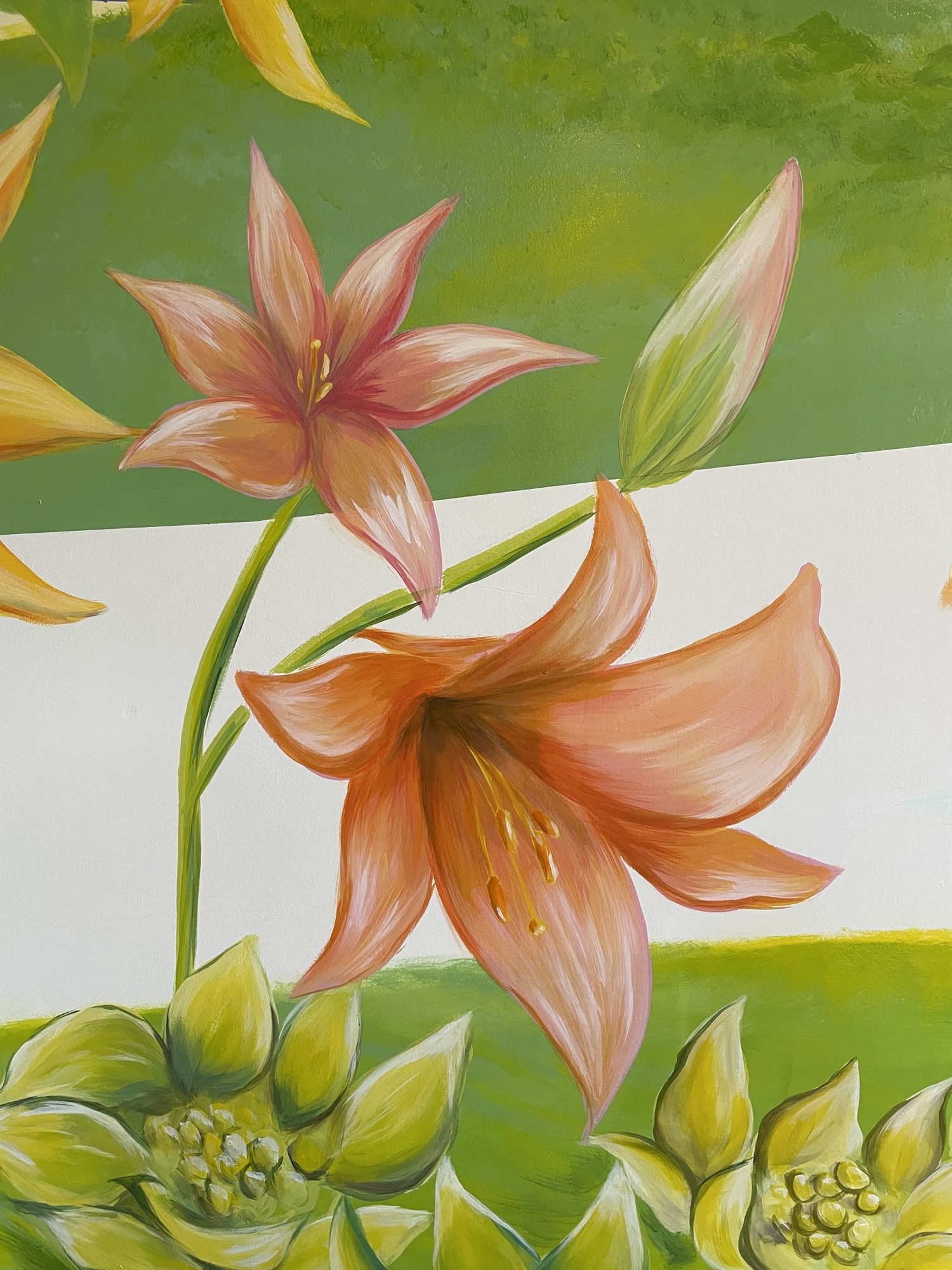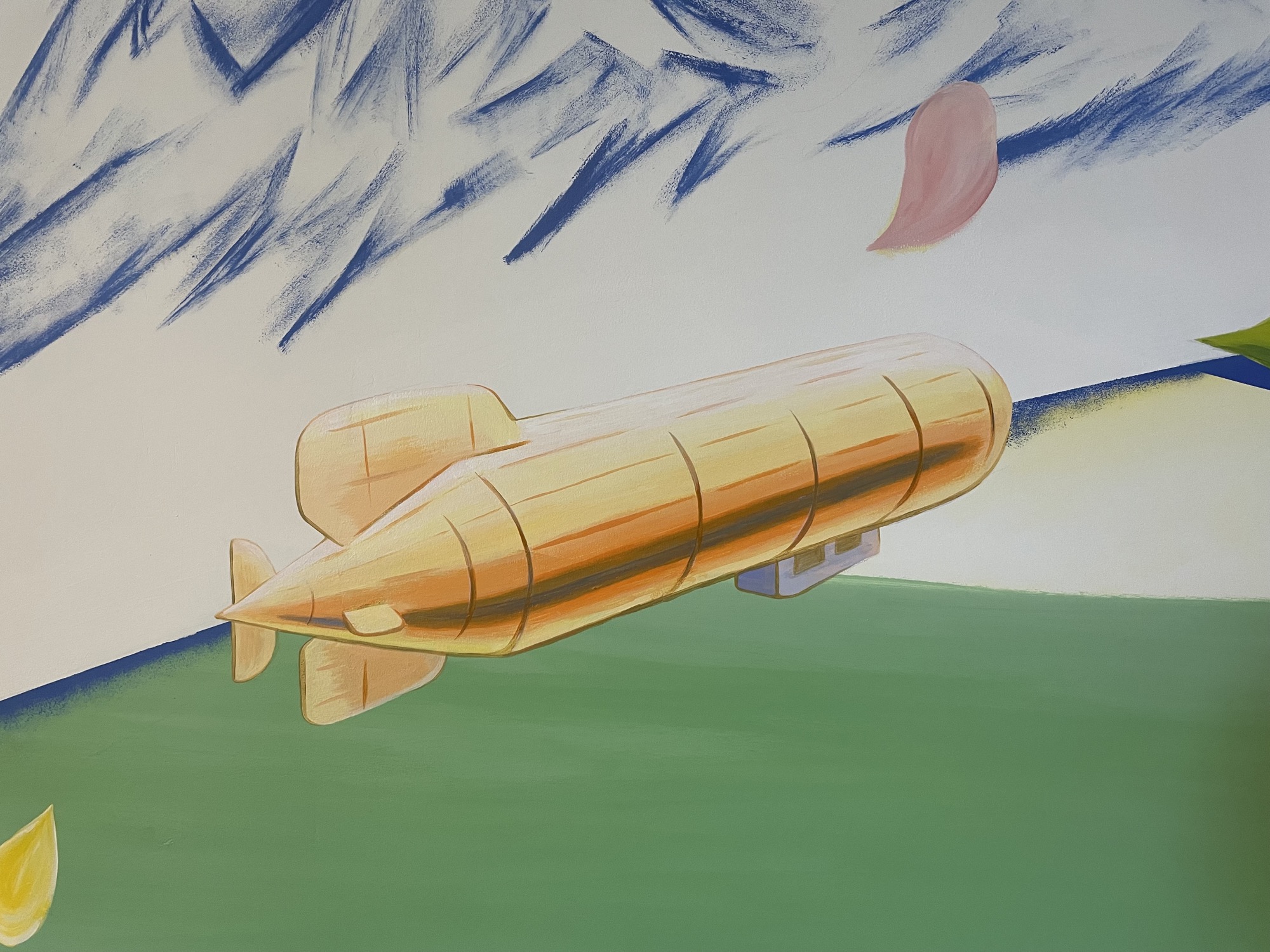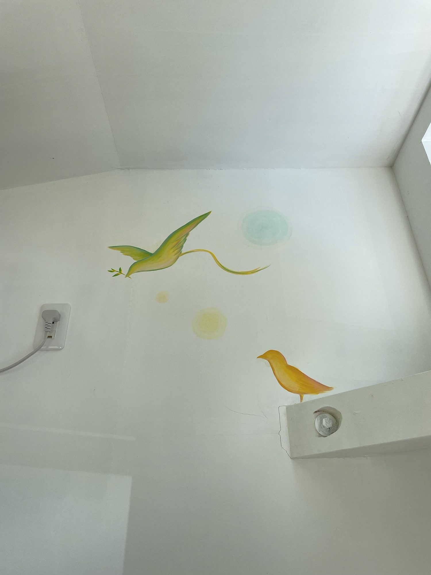 At HIeDa Lodge at Cortina Ski Resort, I painted several murals. I depicted many animals and plants—including the owner’s six dogs and three cats—along with the Northern Alps. Painting three living-room walls plus the ceiling was challenging, but I believe it created a strong and memorable spatial effect.