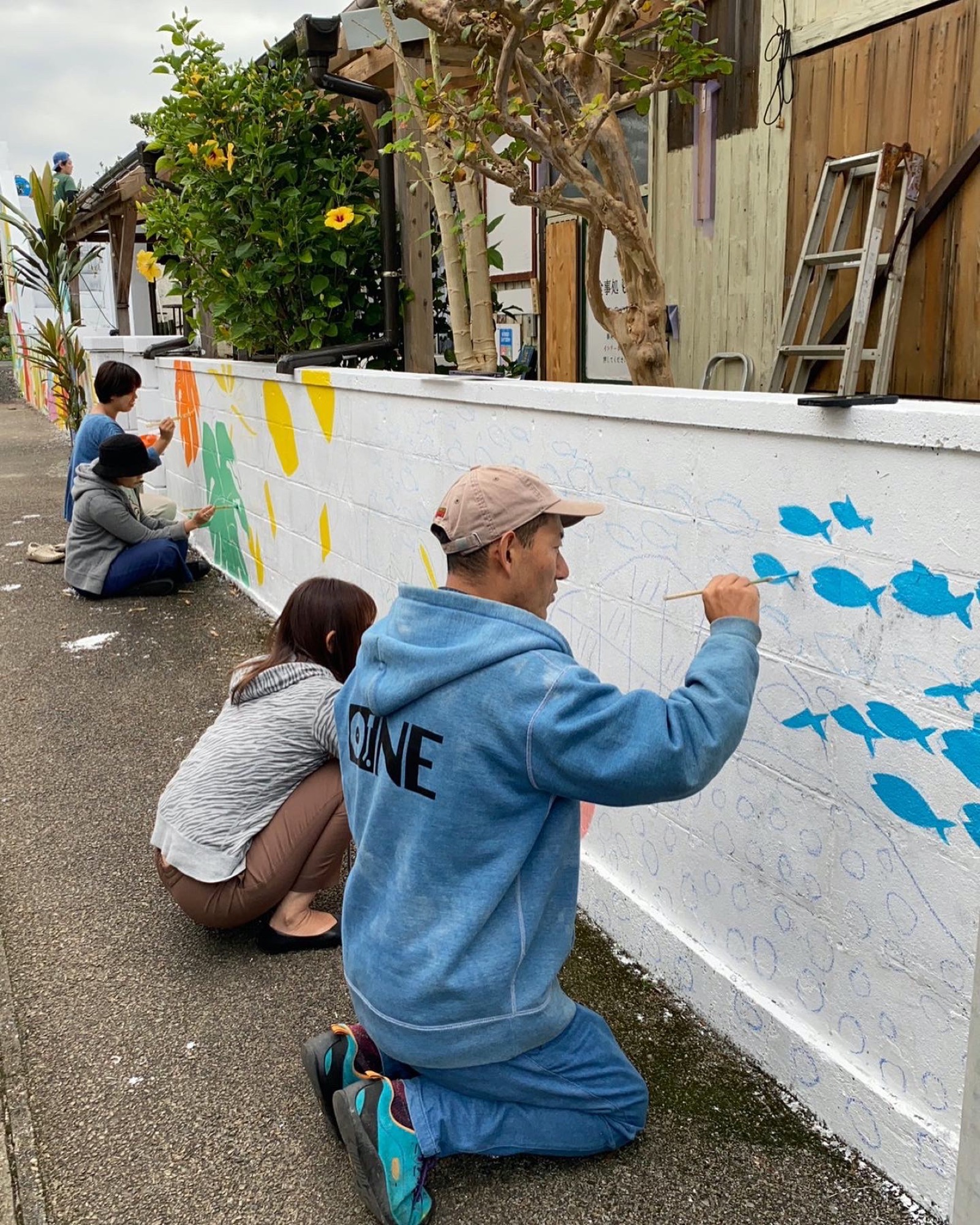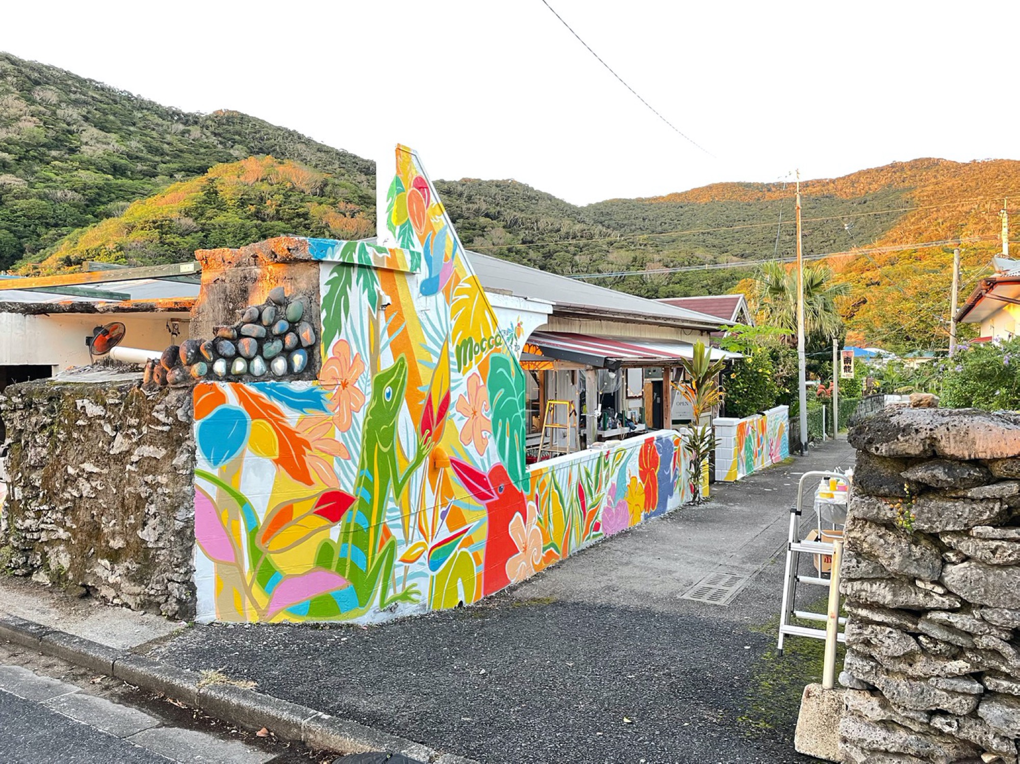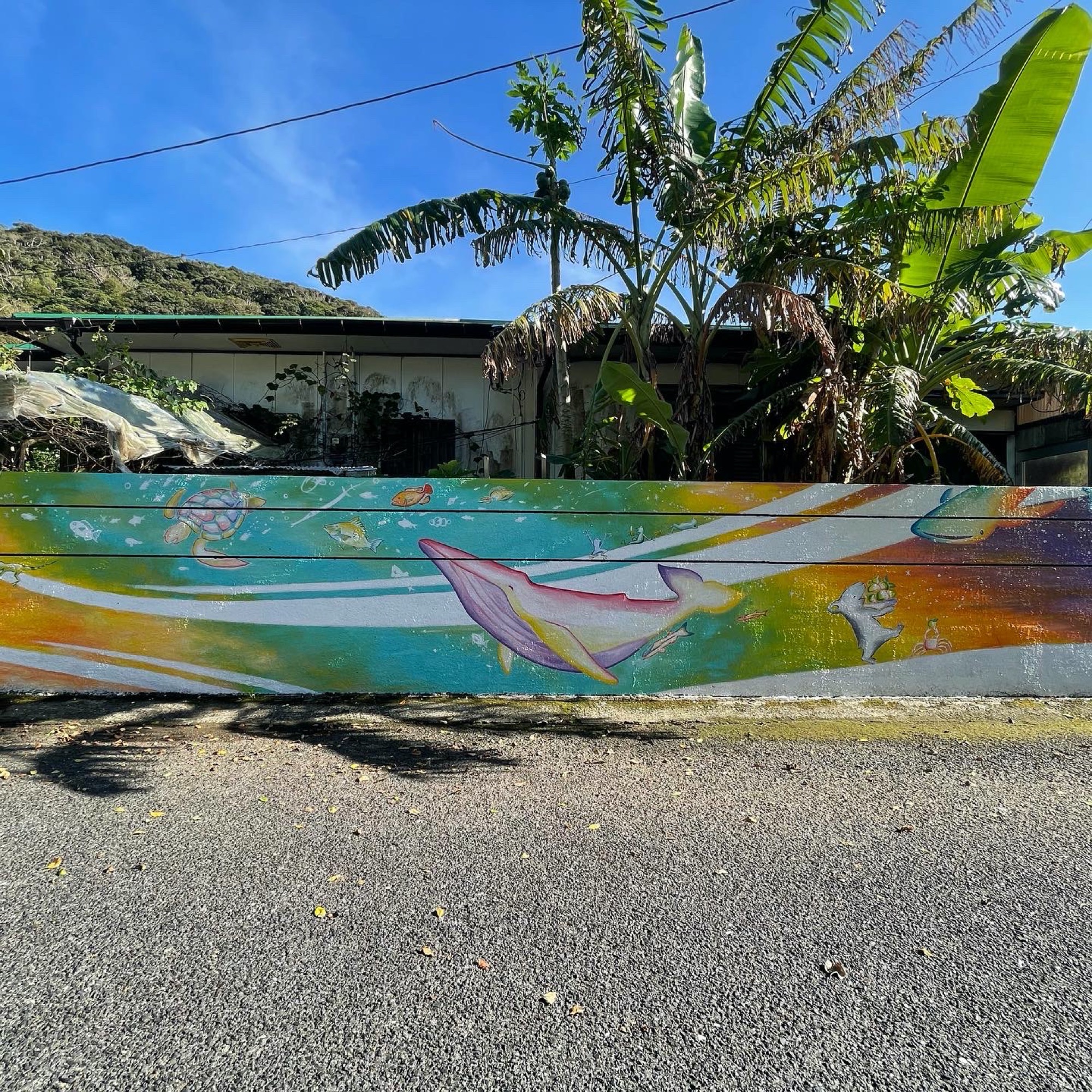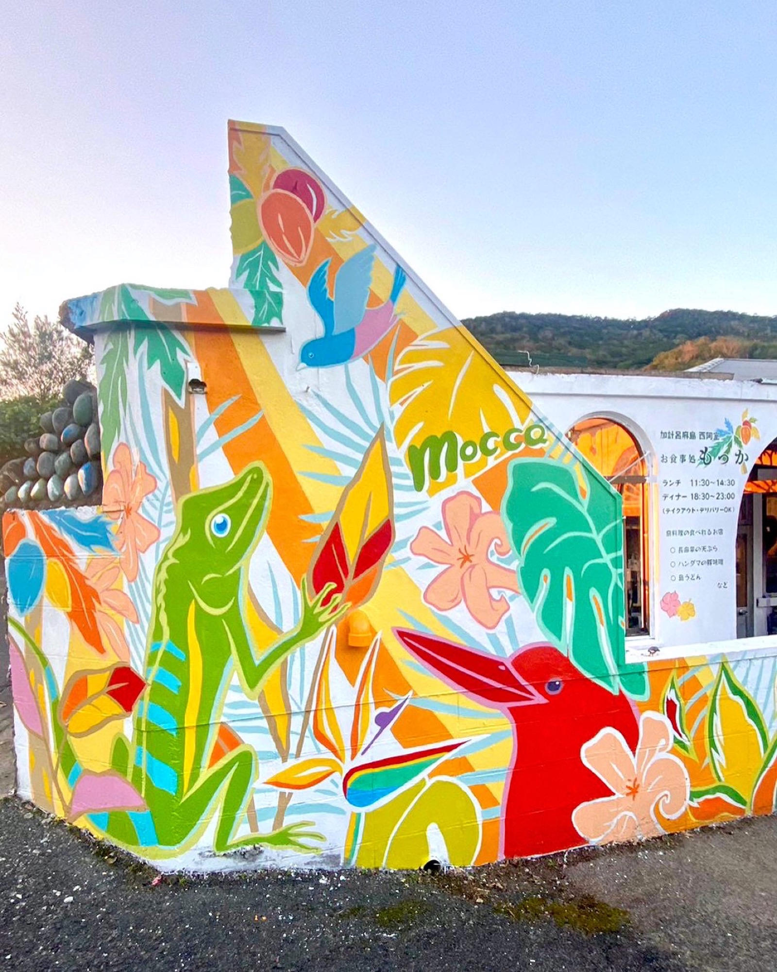 奄美大島の離島、加計呂麻島の西阿室にある『お食事処もっか 』の外壁に絵を描かせて頂きました。今回は西阿室の方々にも協力してもらい、一つの壁画を皆んなで完成させました。滞在中は雨も多く描ける日が限られていた中、多くの人の力を借りて形にすることができました。加計呂麻に行ったら必ず立ち寄って、美味しい料理と黒糖焼酎を味わってもらいたいです。