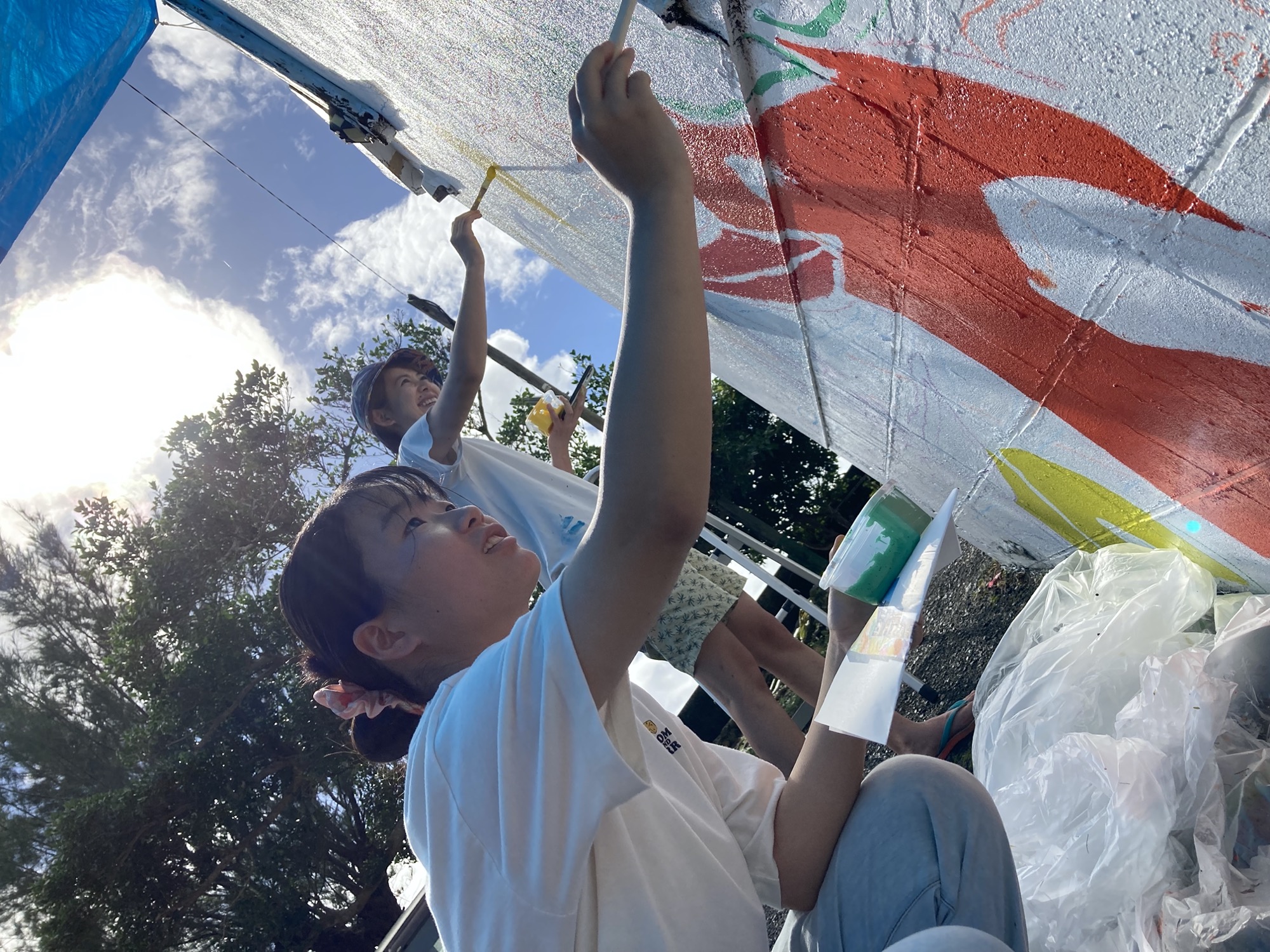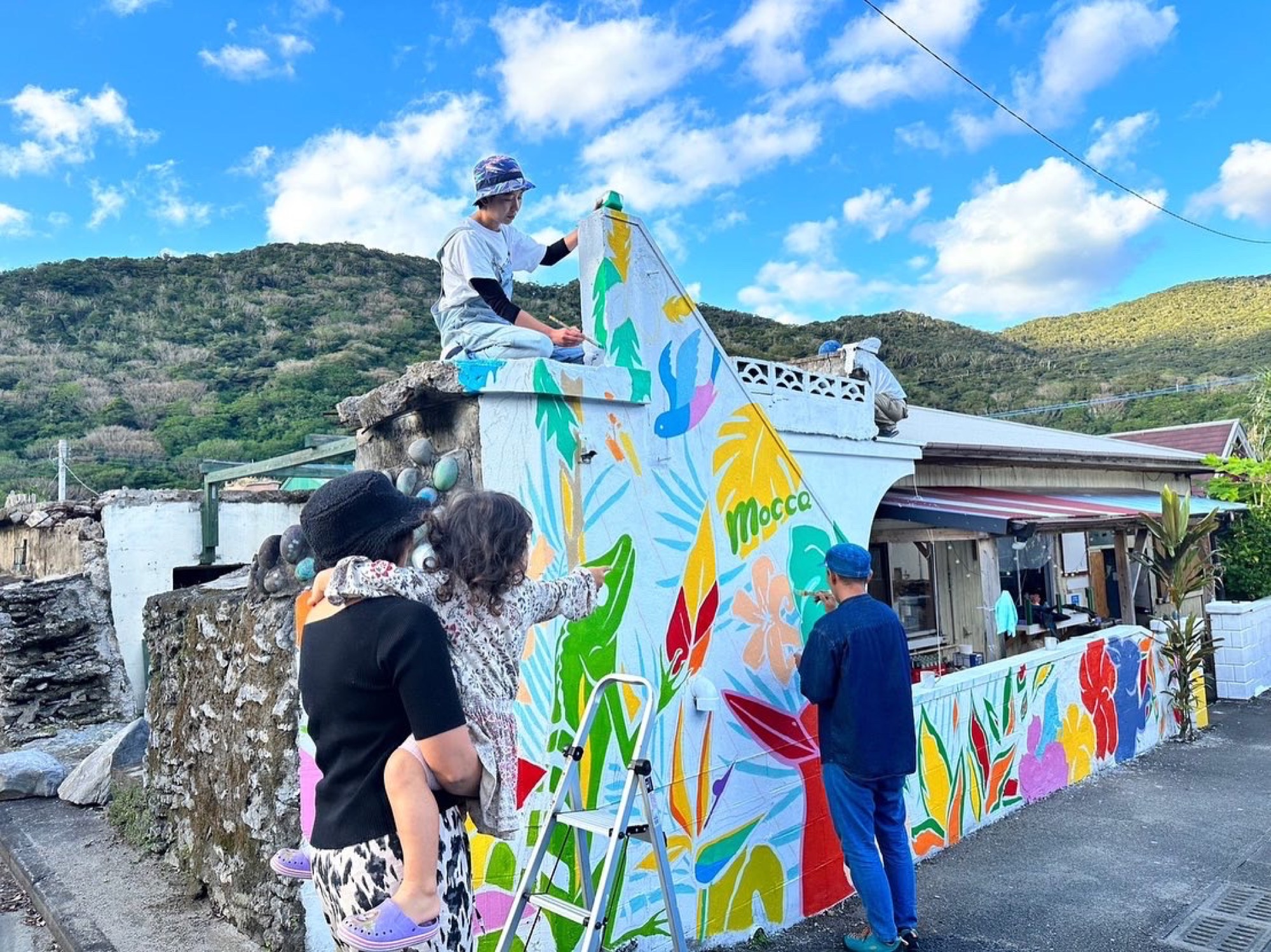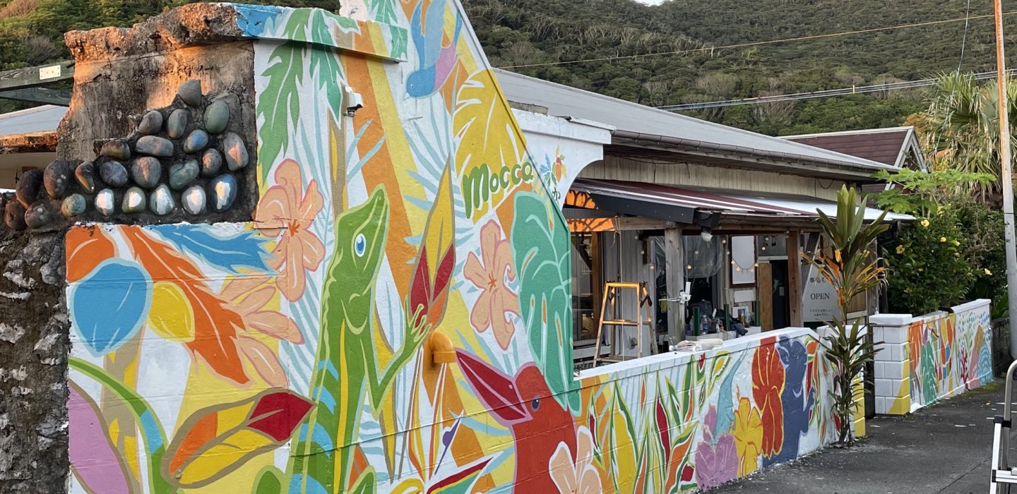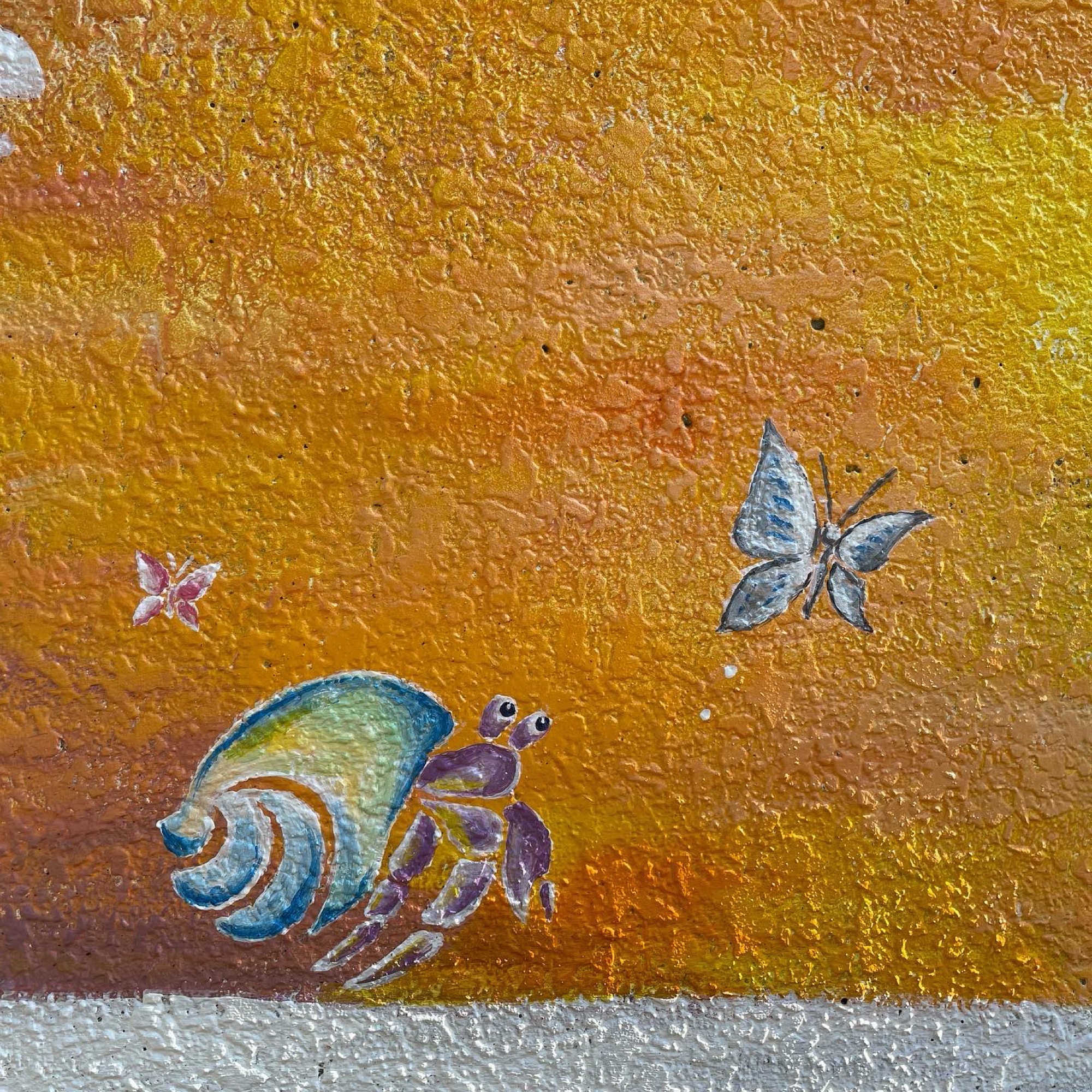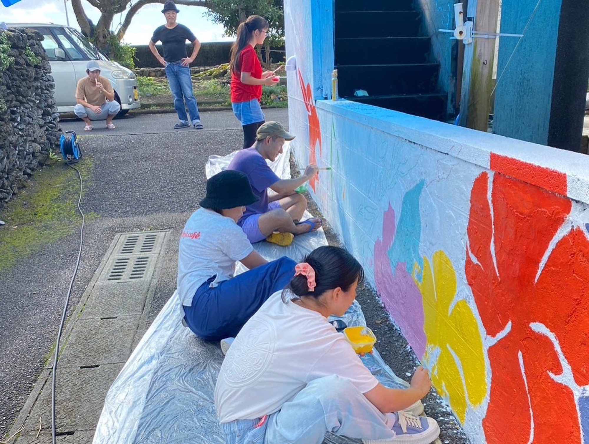 奄美大島の離島、加計呂麻島の西阿室にある『お食事処もっか 』の外壁に絵を描かせて頂きました。今回は西阿室の方々にも協力してもらい、一つの壁画を皆んなで完成させました。滞在中は雨も多く描ける日が限られていた中、多くの人の力を借りて形にすることができました。加計呂麻に行ったら必ず立ち寄って、美味しい料理と黒糖焼酎を味わってもらいたいです。