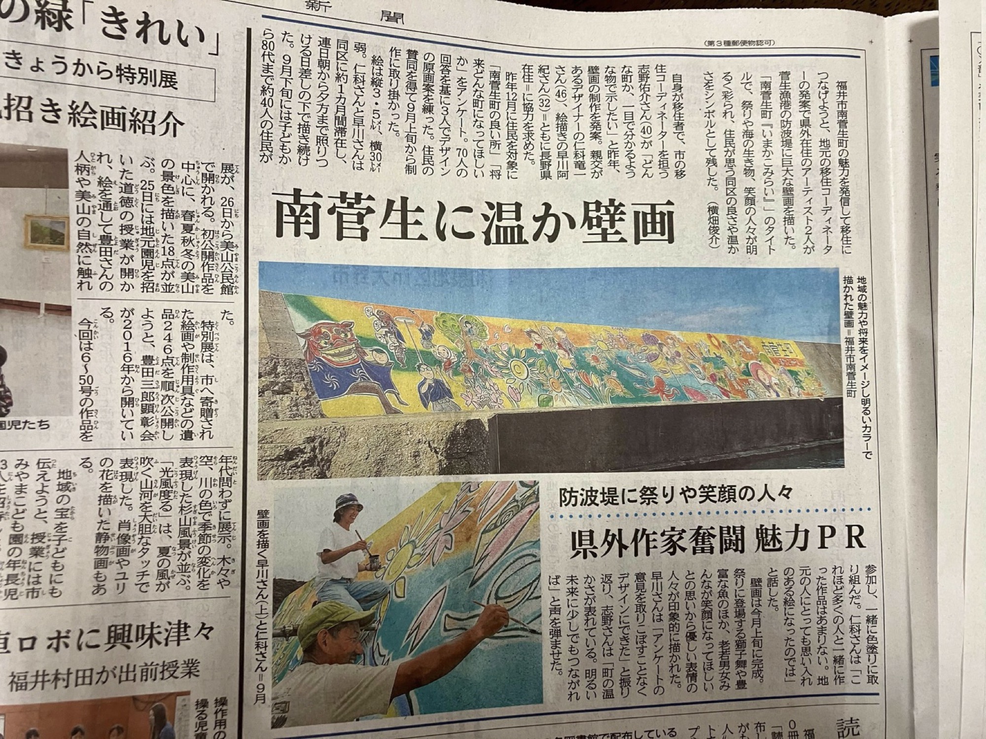 「越前海岸盛り上げ隊」との共同プロジェクト。高齢化が進む集落を盛り上げ、地域活性事業の一環として制作。デザイン内容としては、集落の方々からこの町の「いま、かこ、みらい」についてのアンケートを実施し、そこからアイデアを絵に起こしました。施行中には参加型ライブペイントとしてイベントを開催。集落に住むたくさんの人の力を借りることによって完成した作品です。
