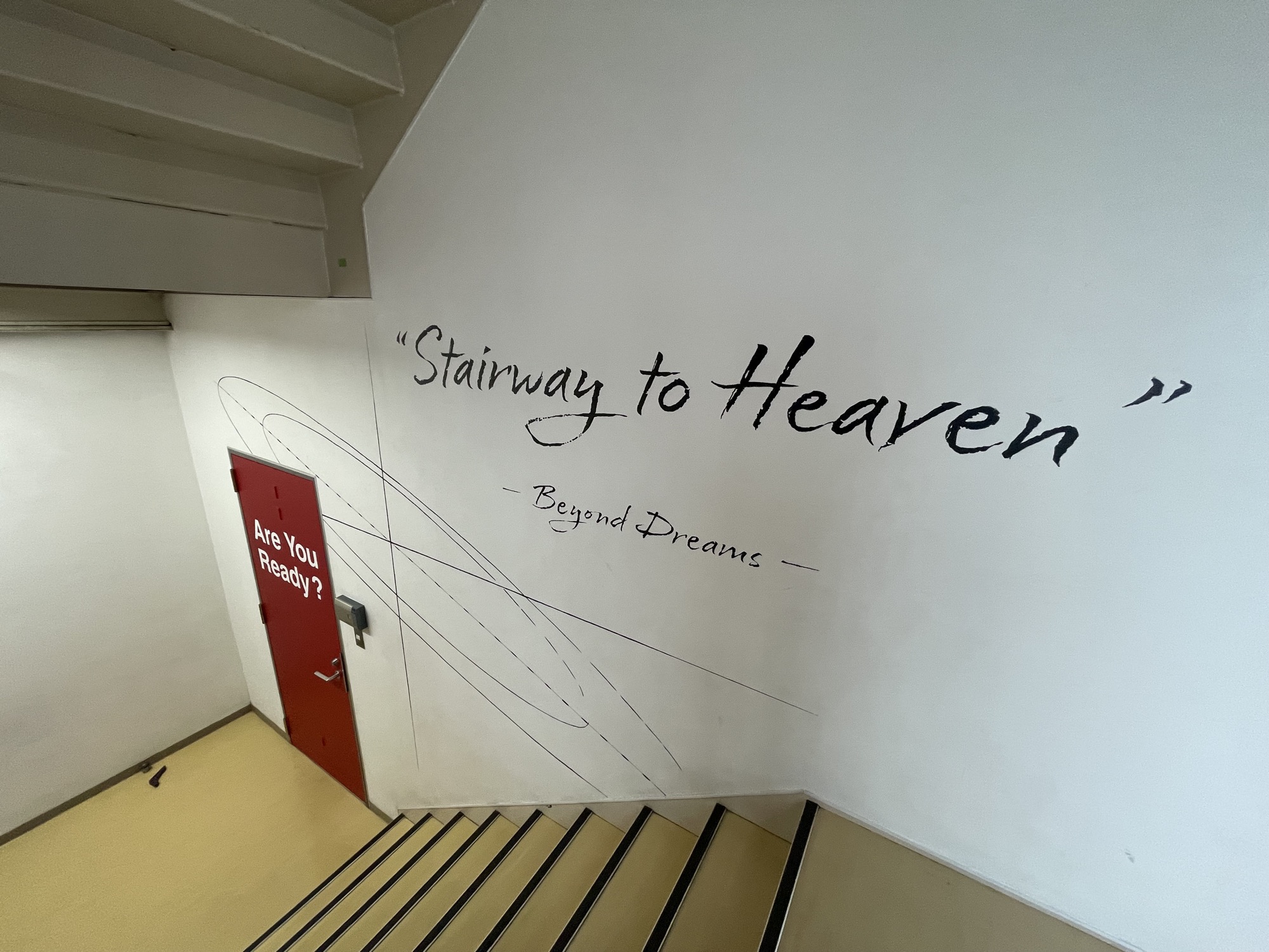 横浜市都筑区にあるgoof.CAMPUSの壁画「Stairway to Heaven-Beyond Dreams-」の制作を担当させて頂きました。株式会社グーフ様の施設goof.CAMPUSの”常識や枠組みにとらわれず、自ら問いを立てながら進む姿勢”から連想した「アストロラーべ」をモチーフとして提案させて頂きました。そして9つのキーワードを手書き風に描き、その中の一つの壁はスタッフの皆様と一緒に描き上げました。候補の10数組のアーティストの中から選んでいただき、素敵なスタッフの皆様とプロジェクトを一緒に形にできたことを、とても嬉しく思っています。