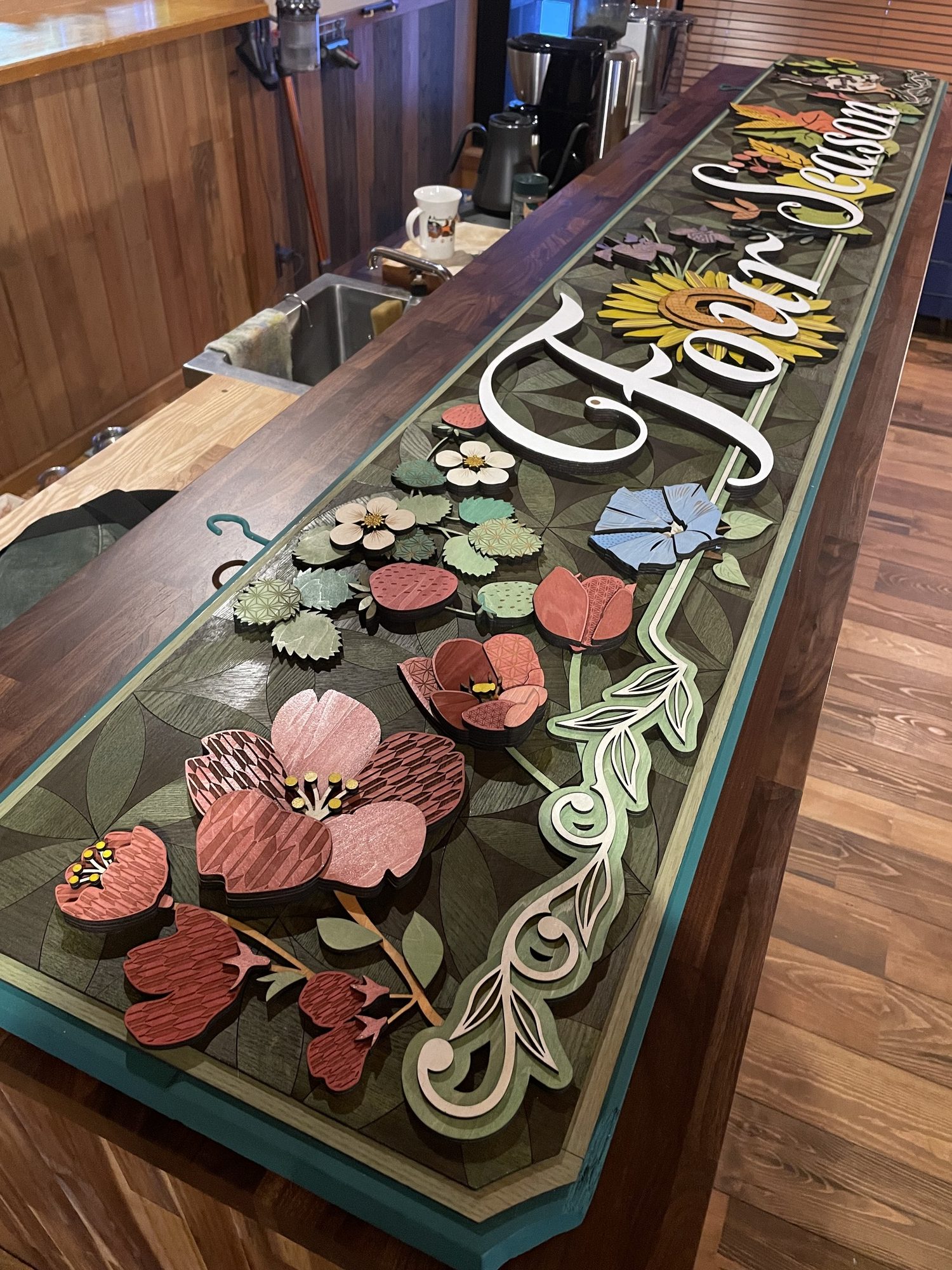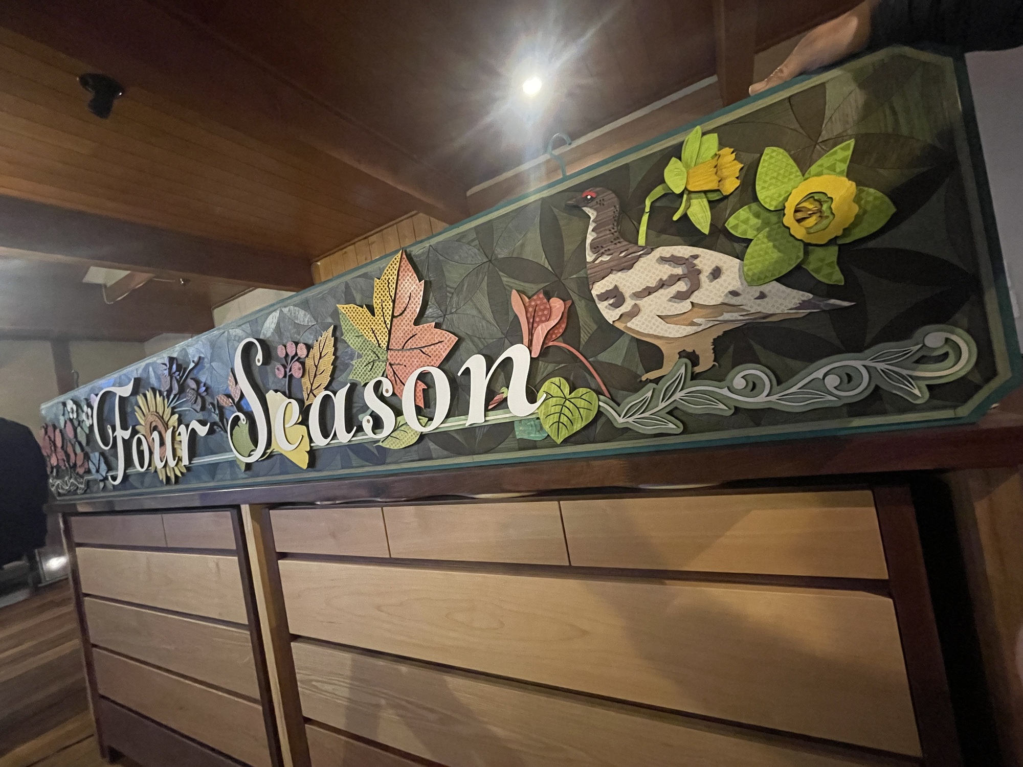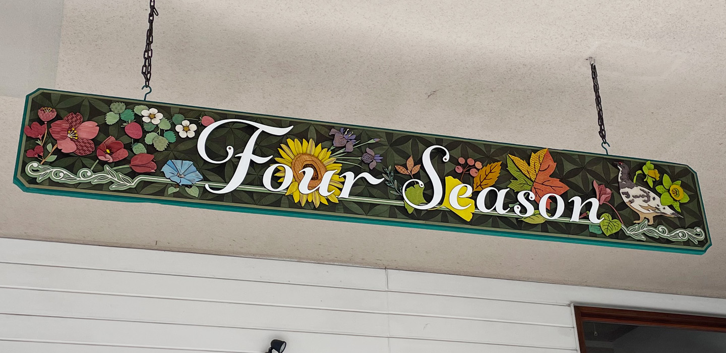 長野県白馬村にある宿泊施設Four season様の吊り下げ式看板を制作致しました。Four seasonの名前にある通り白馬の春、夏、秋、冬の四季をモチーフにデザイン致しました。