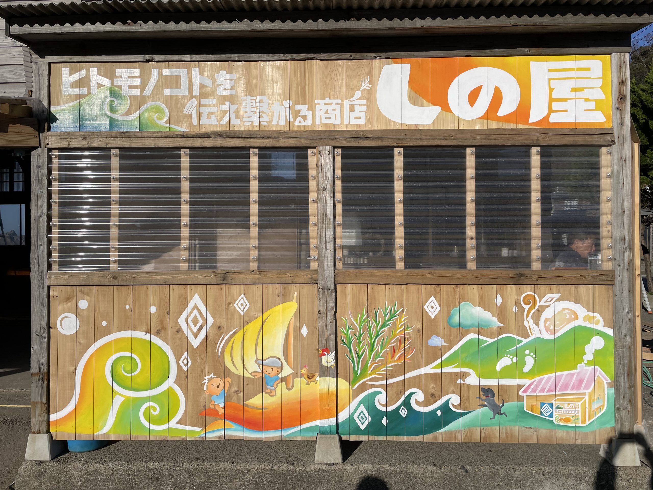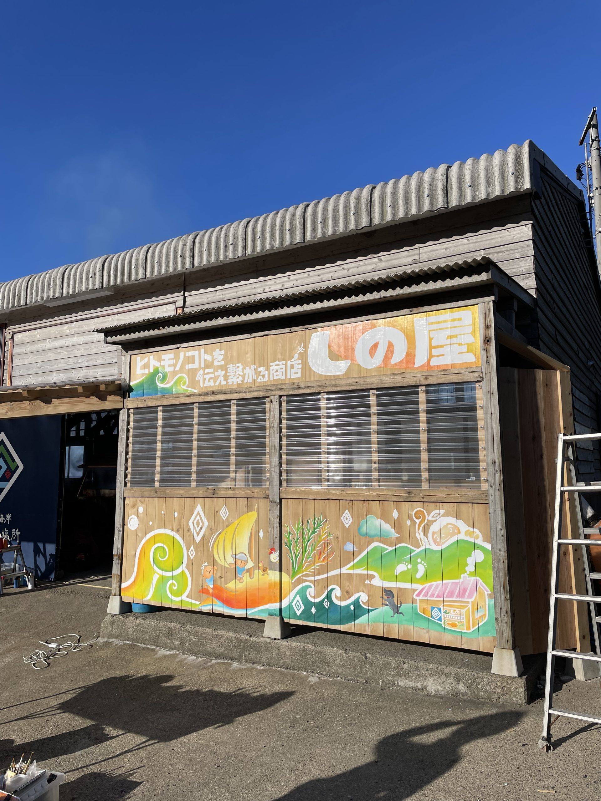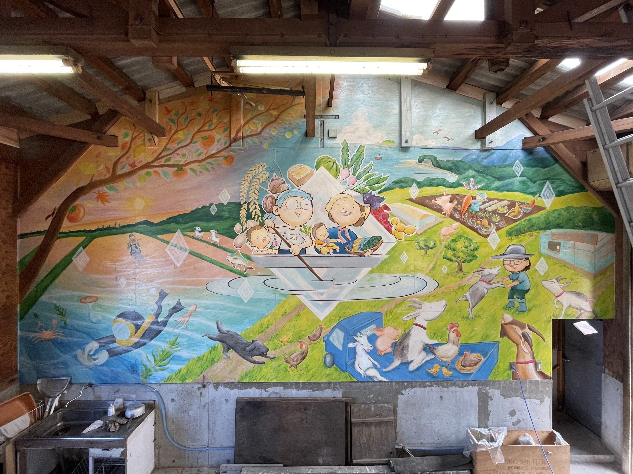 福井県越前海岸にある志野製塩所の外と内の壁に絵を描かせて頂きました。「そこにある暮らし」をテーマに、クライアント様の家族、夕日の映る水田、実際に飼育する動物たちなどを描きました。初回作成から2年後に再び訪れ、増えた家族や動物たちを描き足しました。絵を通して人との繋がりを感じる作品となりました。