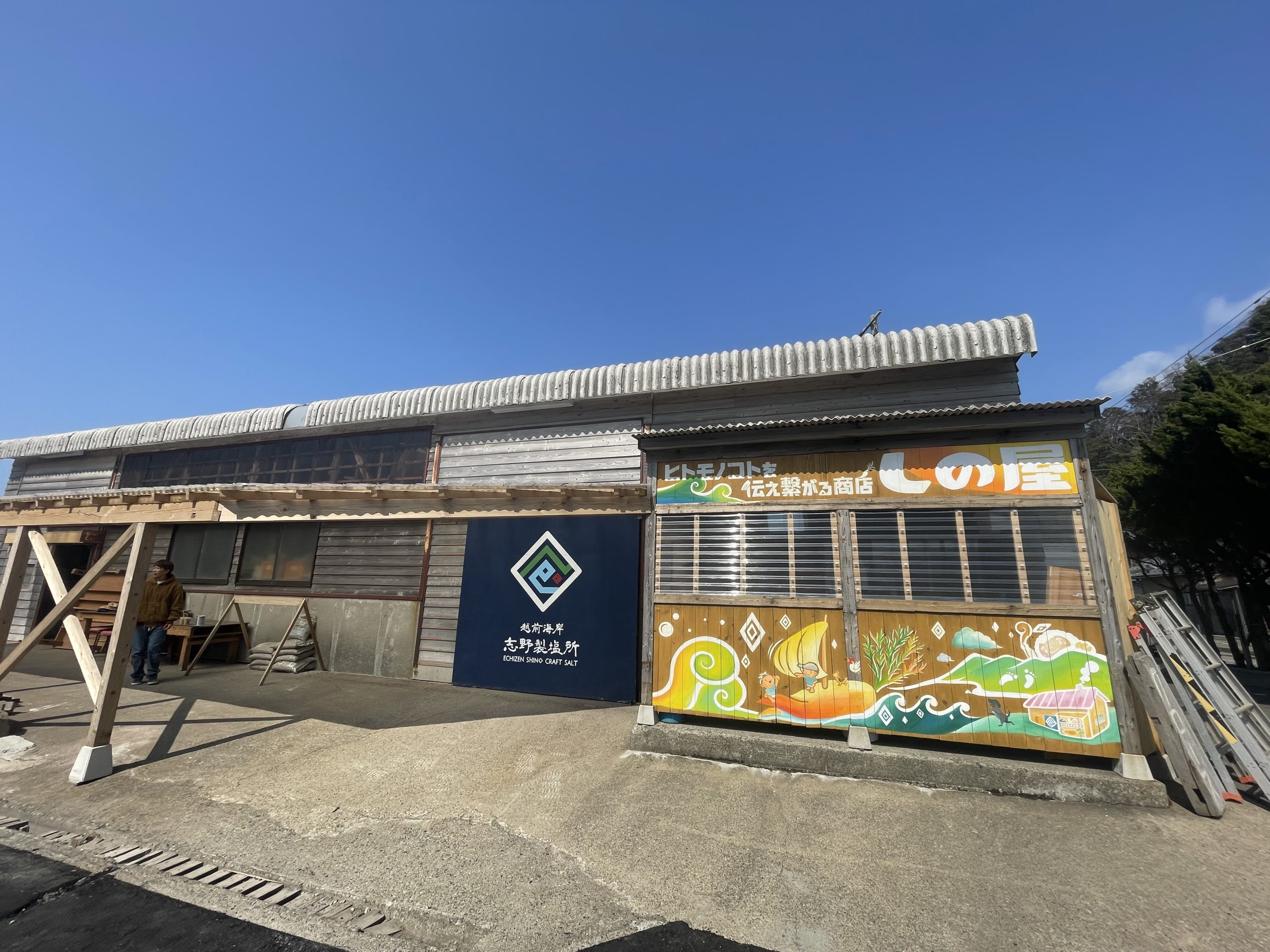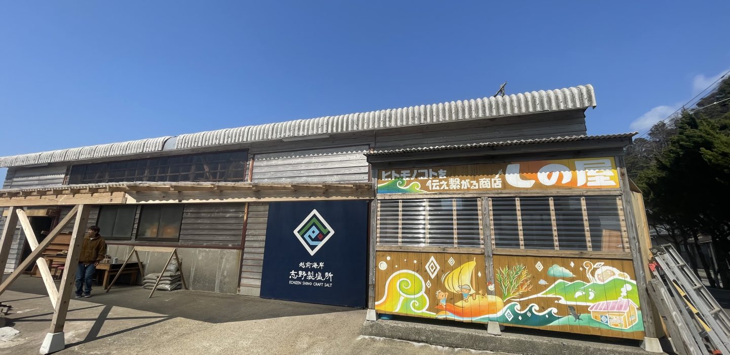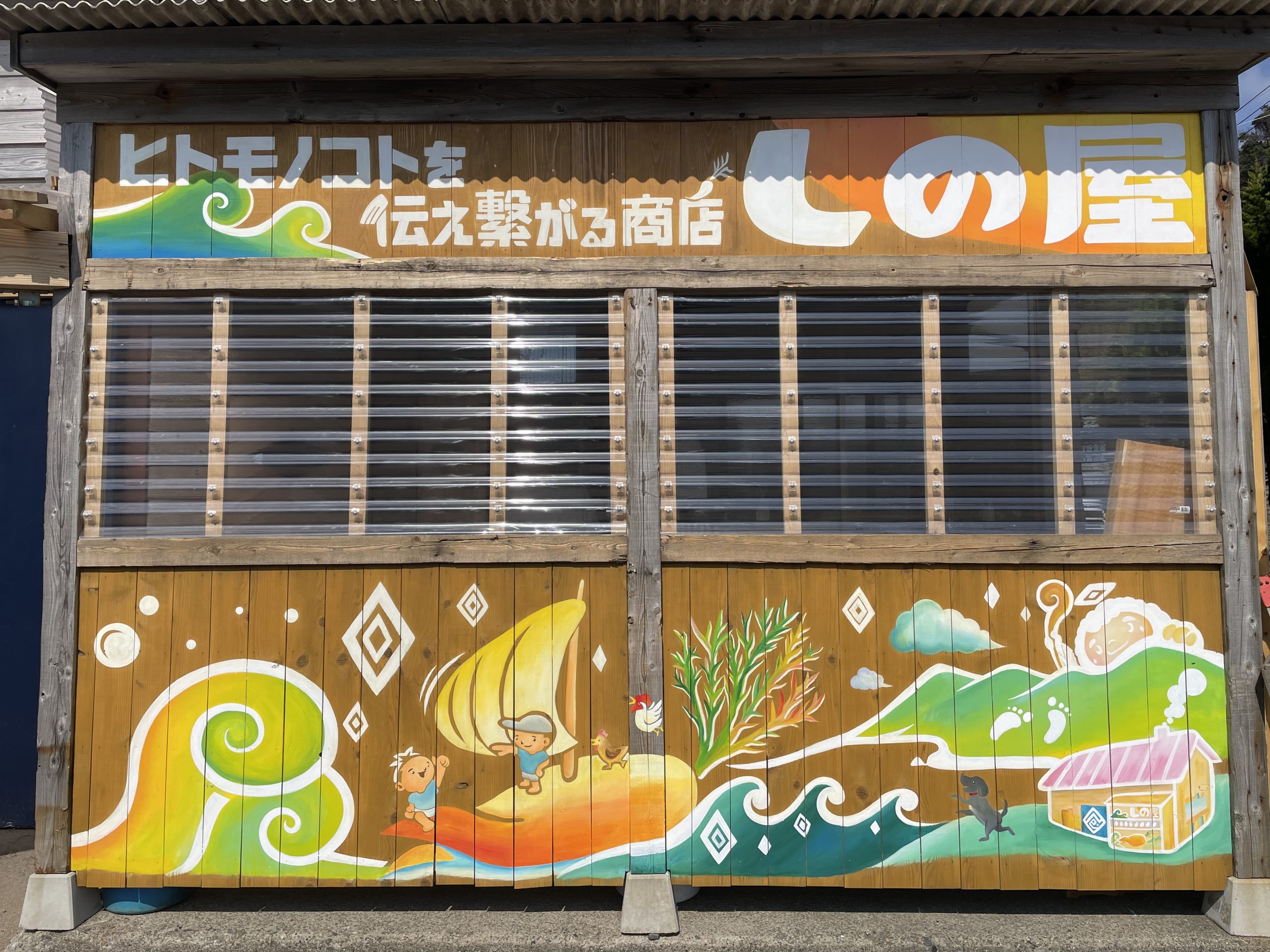 福井県越前海岸にある志野製塩所の外と内の壁に絵を描かせて頂きました。「そこにある暮らし」をテーマに、クライアント様の家族、夕日の映る水田、実際に飼育する動物たちなどを描きました。初回作成から2年後に再び訪れ、増えた家族や動物たちを描き足しました。絵を通して人との繋がりを感じる作品となりました。